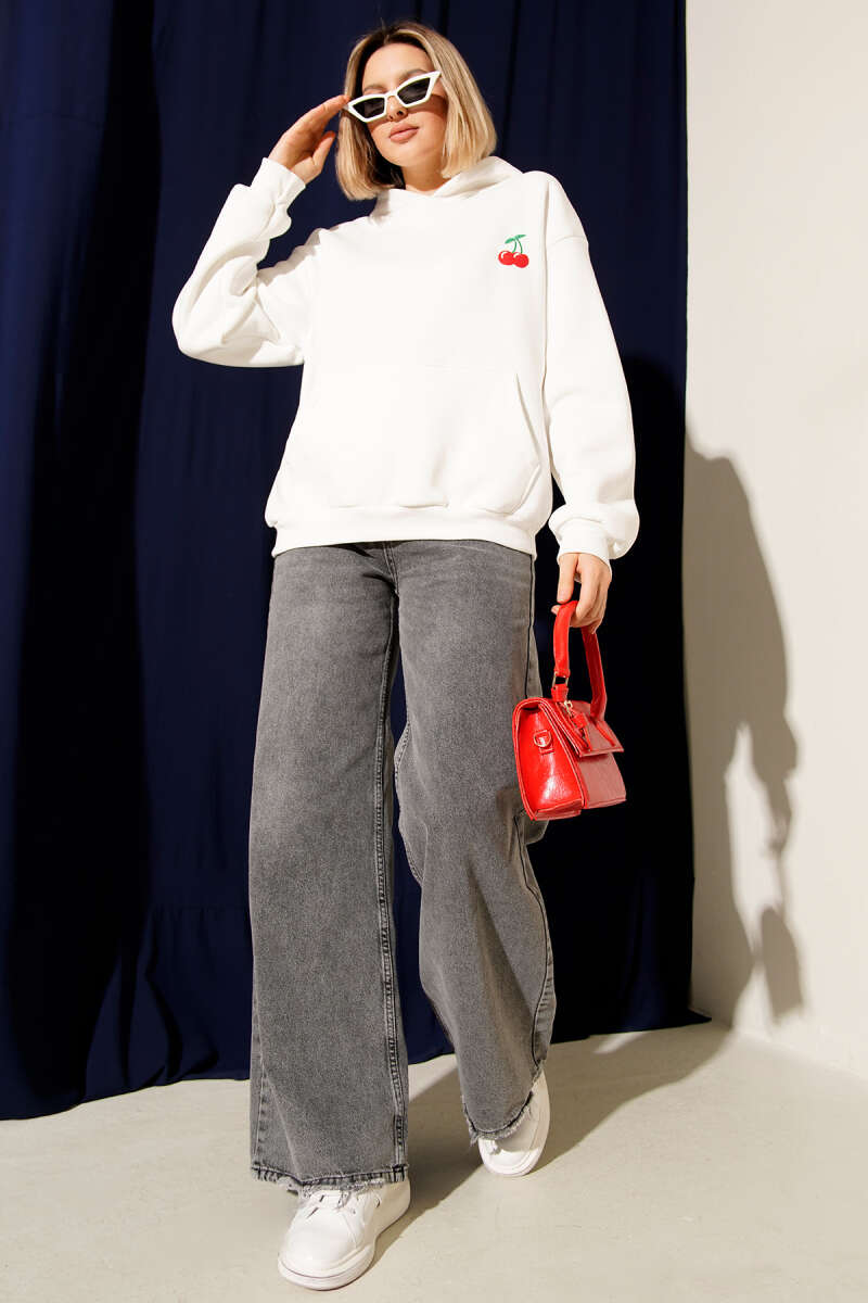 Kapşonlu Kiraz Baskılı Sweatshirt Beyaz
