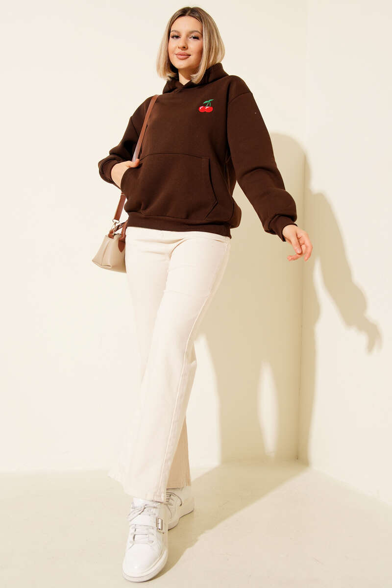 Kapşonlu Kiraz Baskılı Sweatshirt Kahve