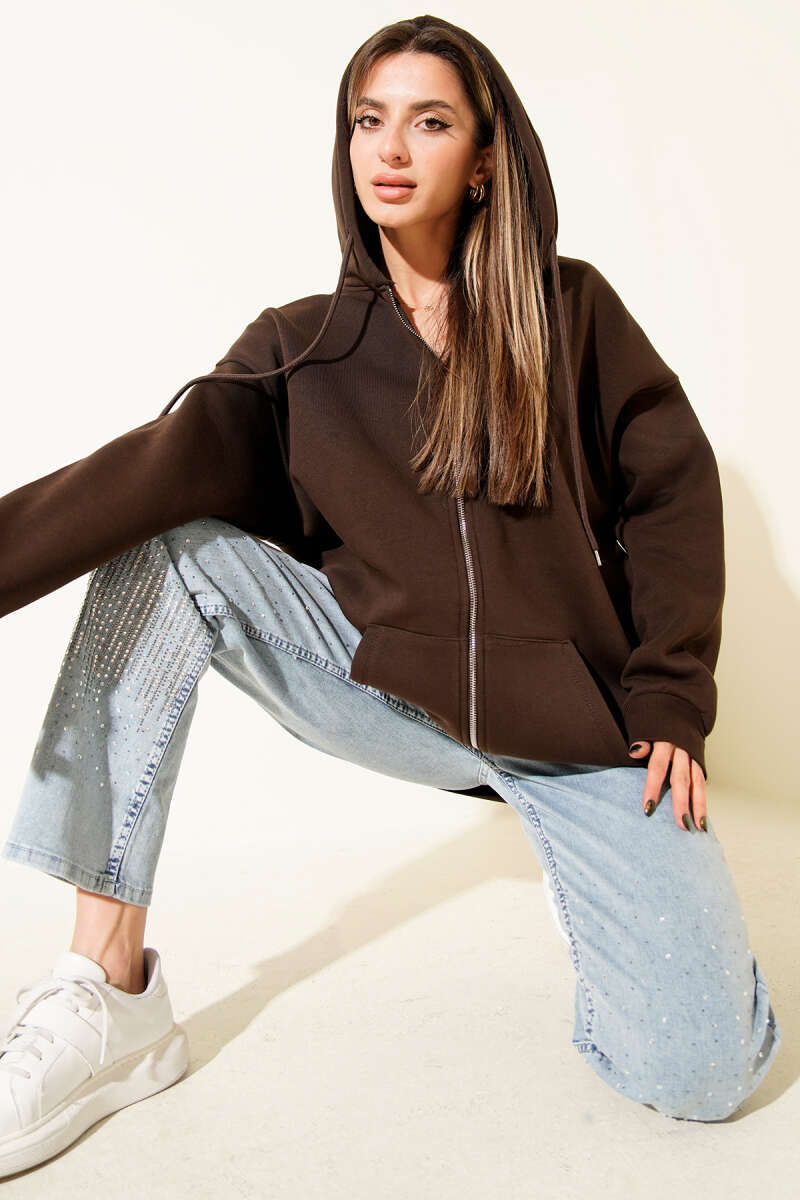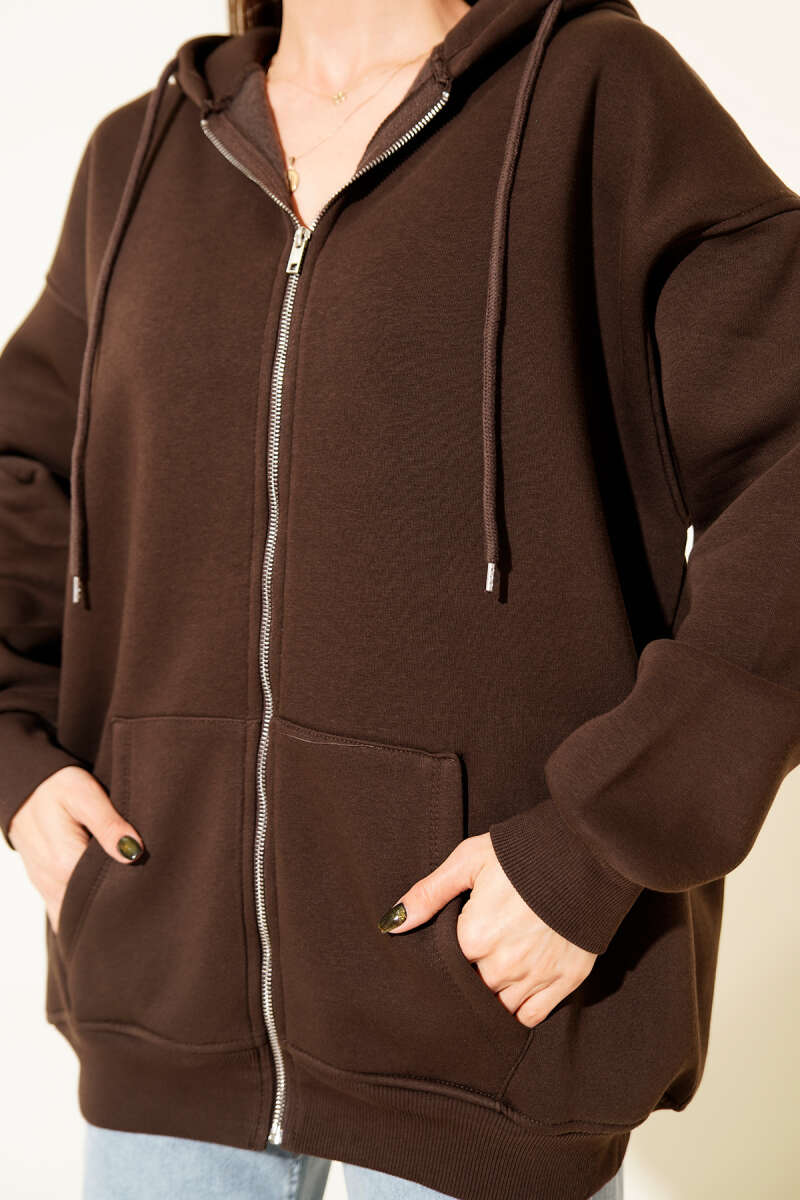 Kapşonlu Üç İpli Fermuarlı Hırka Kahve