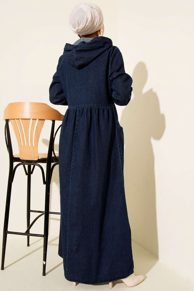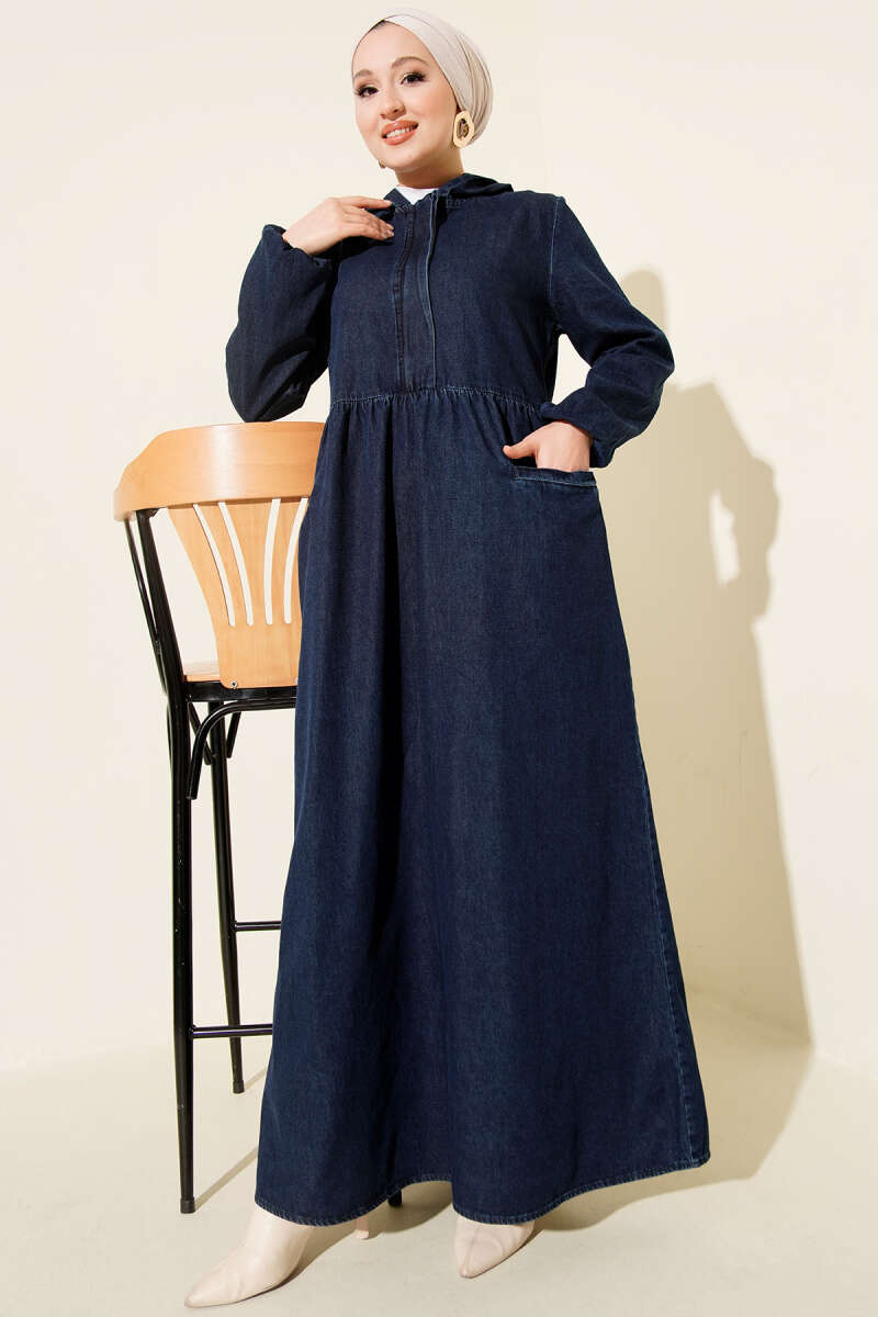 Kapşonlu Yarı Fermuarlı Kot Elbise Mavi