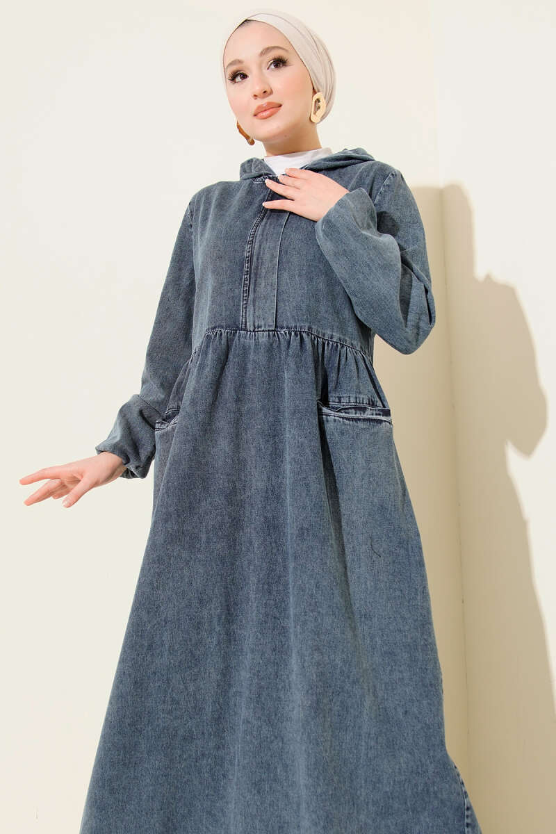 Kapşonlu Yarı Fermuarlı Kot Elbise Füme
