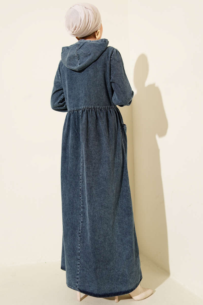 Kapşonlu Yarı Fermuarlı Kot Elbise Lacivert
