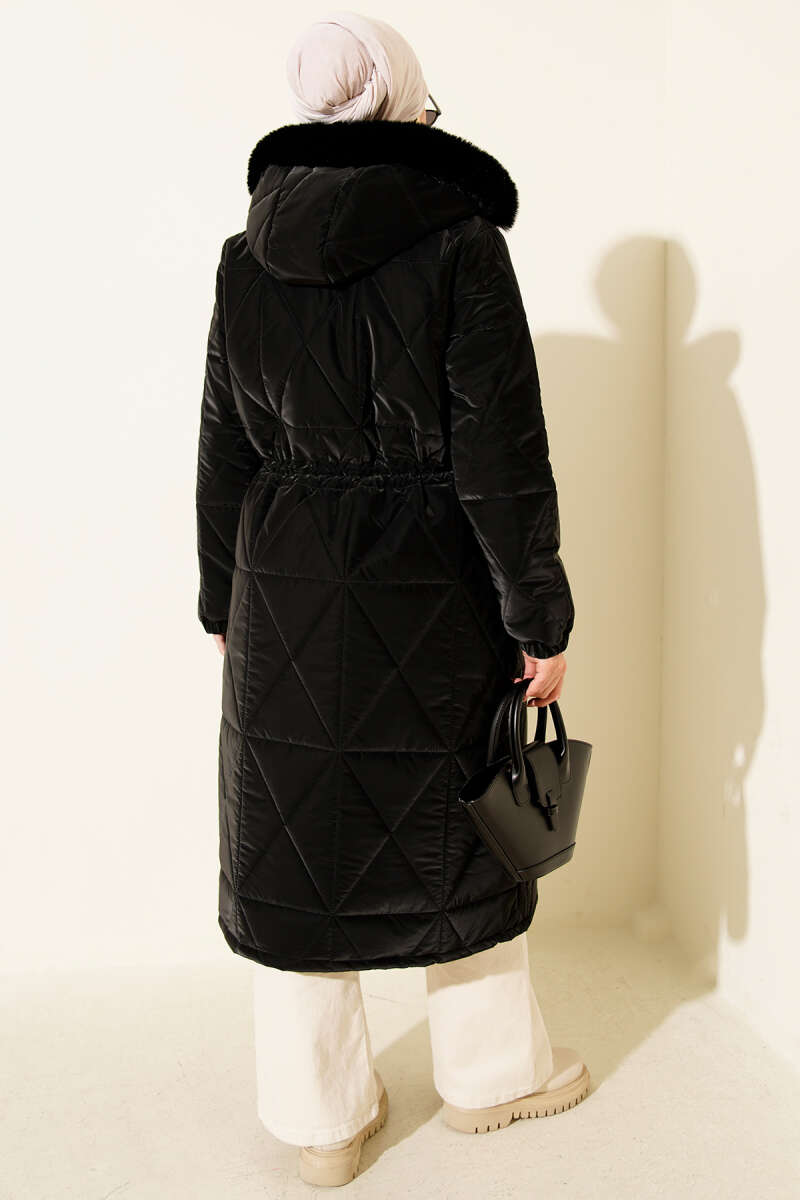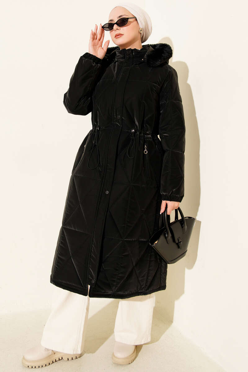 Kaşe Garnili Kapüşonlu Kapitone Uzun Mont Siyah