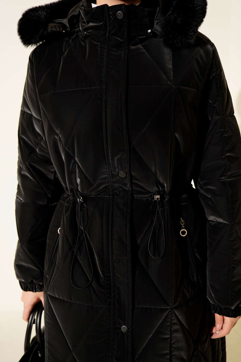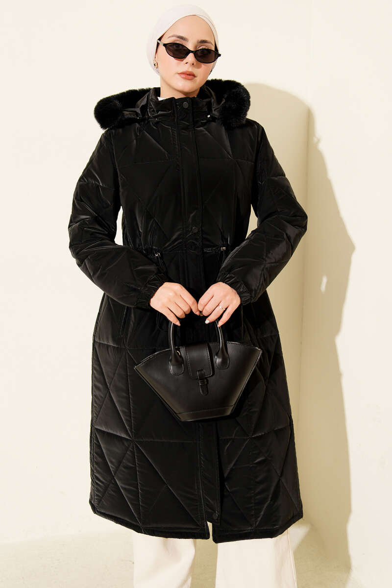 Kapüşonlu Baklava Kapitone Uzun Mont Füme