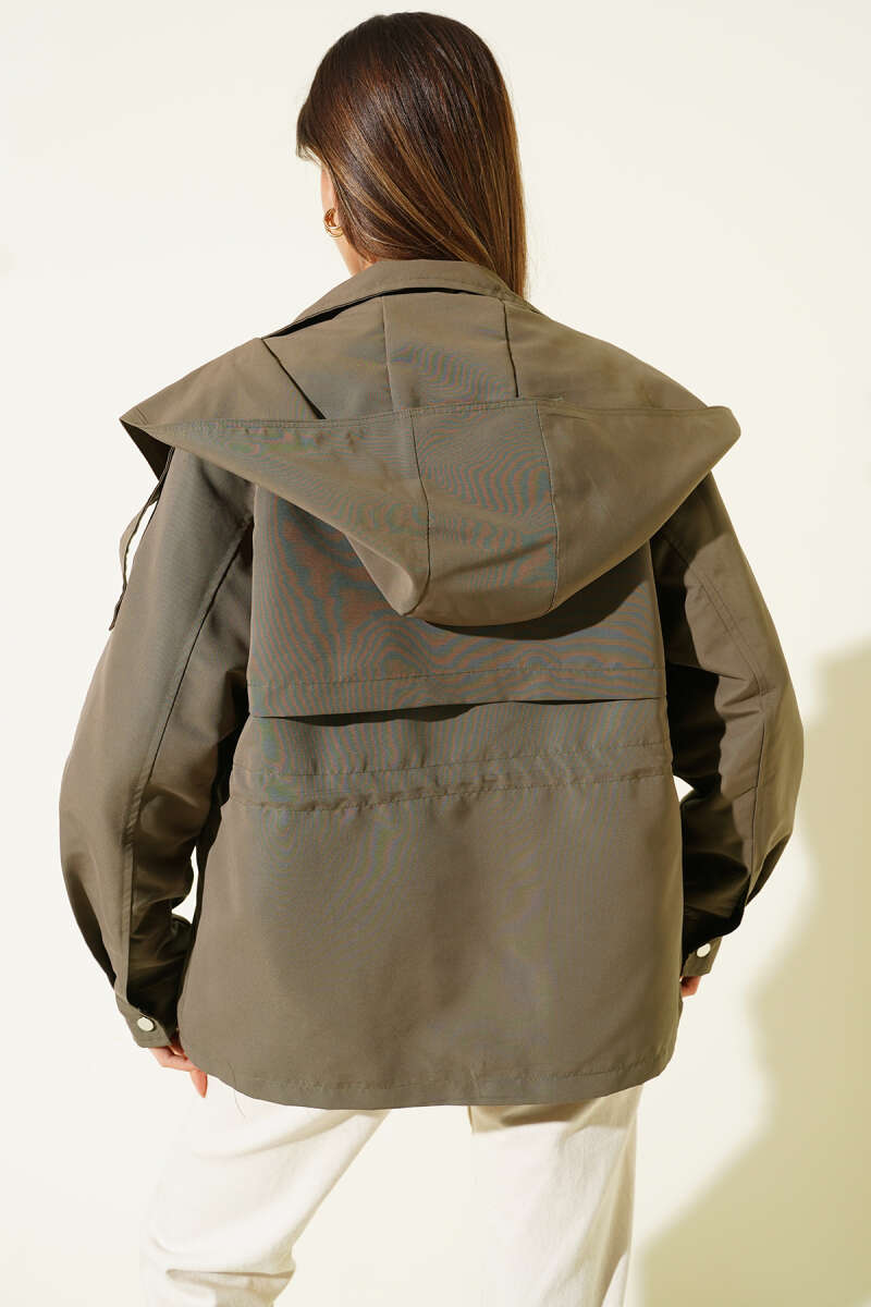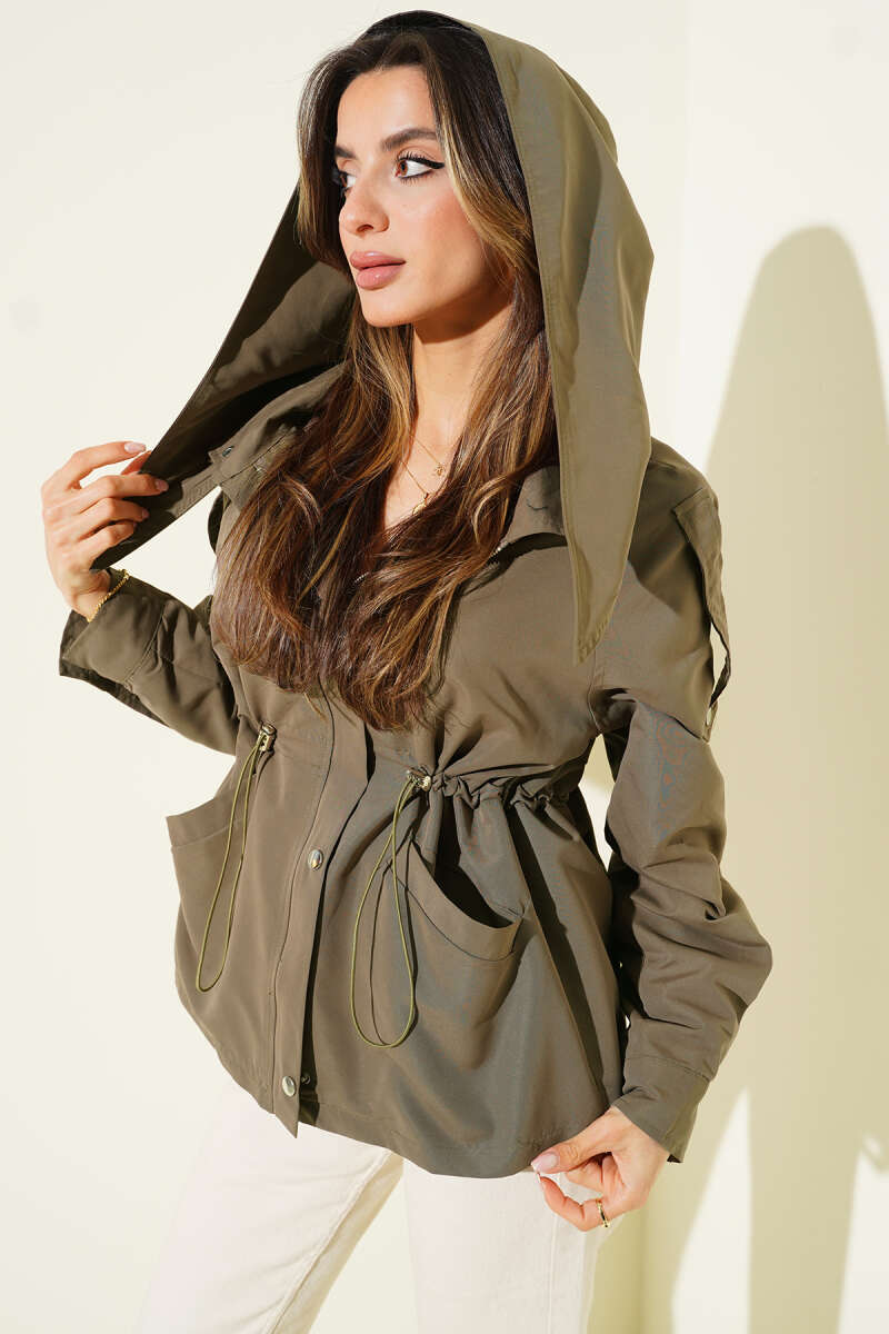 Kapüşonlu Bel Lastikli Kısa Trençkot Kahve