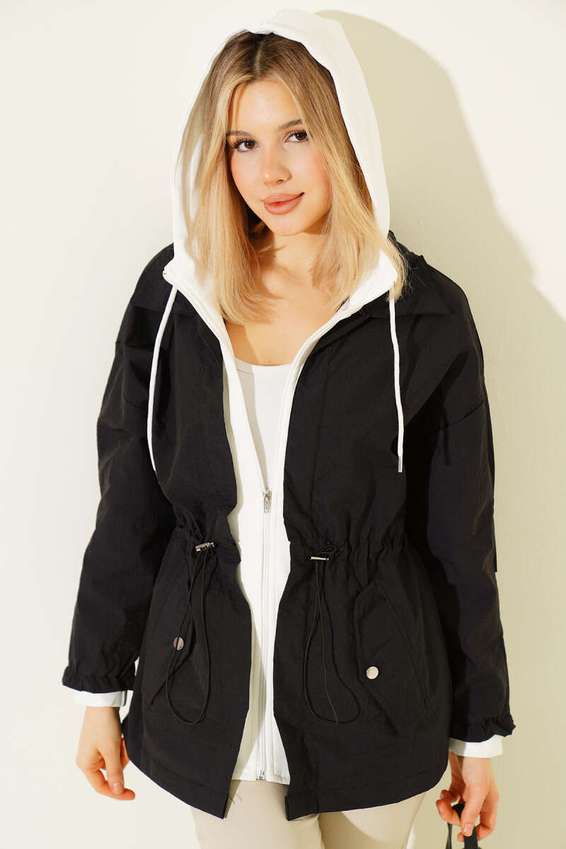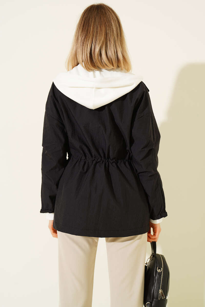 Kapüşonlu Bel Tünelli Paraşüt Ceket Siyah