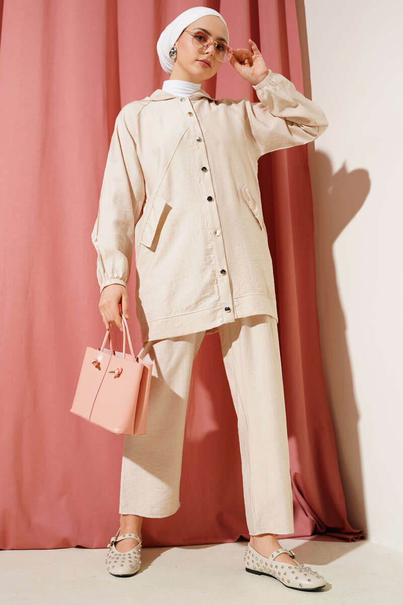 Kapüşonlu Cep Kapaklı İkili Takım Bej