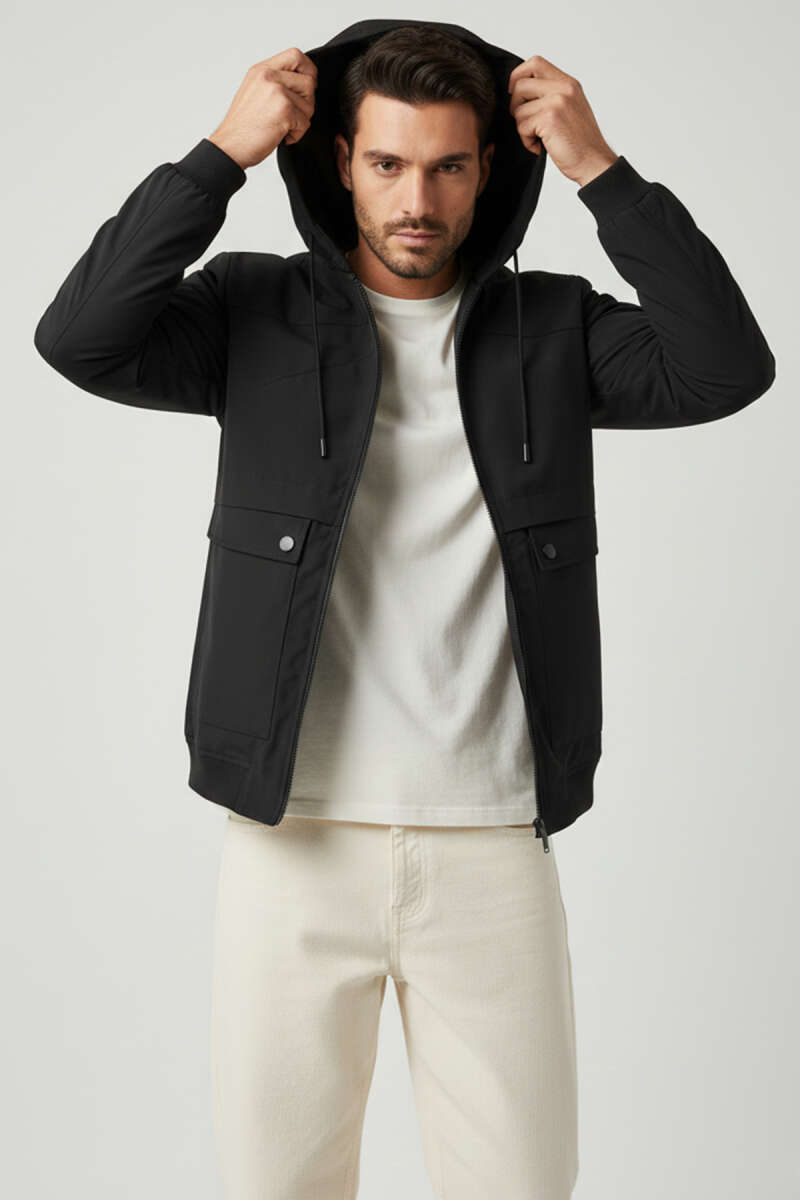 Kapüşonlu Cepli Mevsimlik Mont Siyah