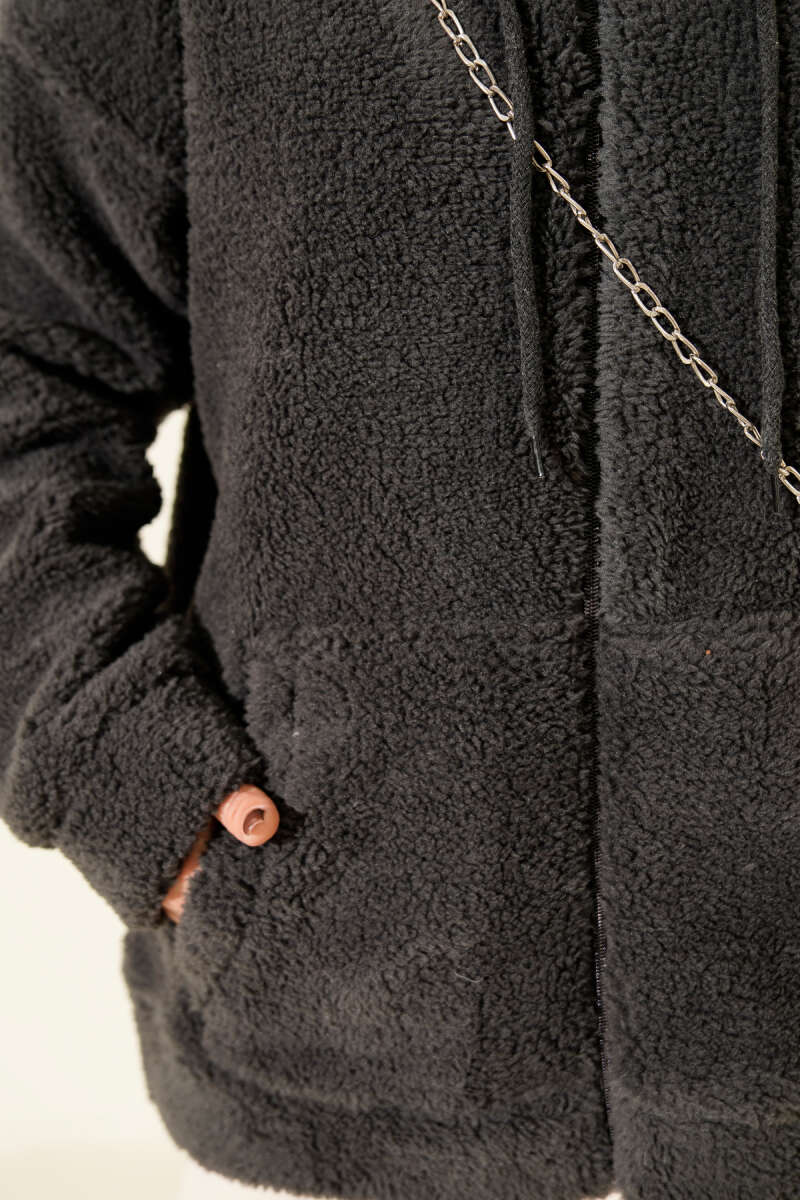 Kapüşonlu Fermuarlı Peluş Mont Hardal