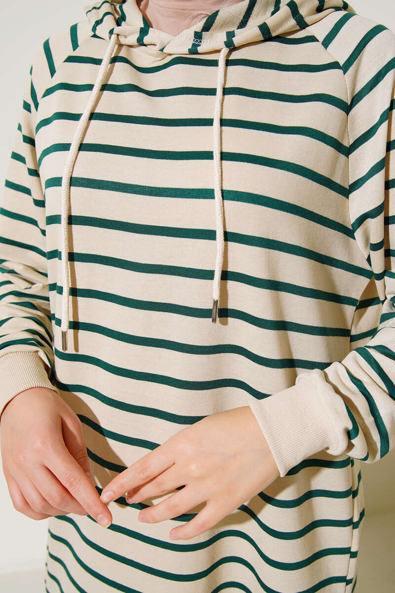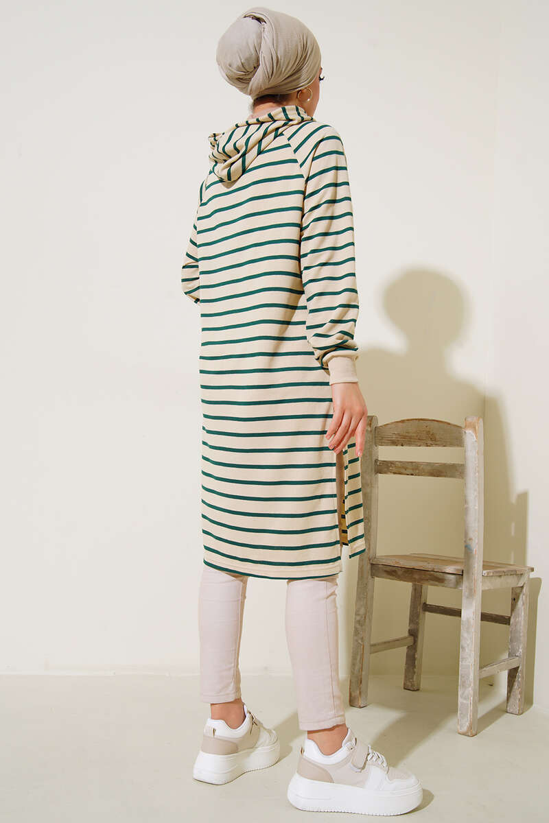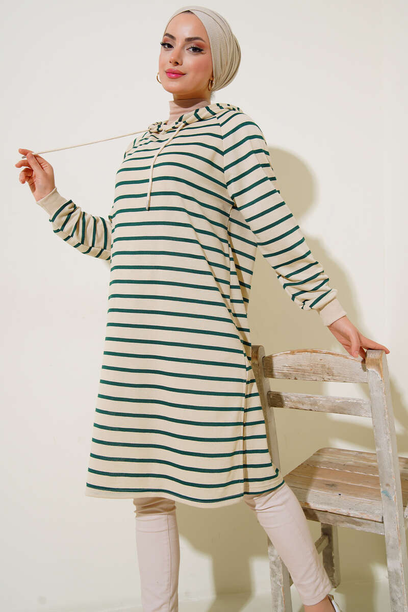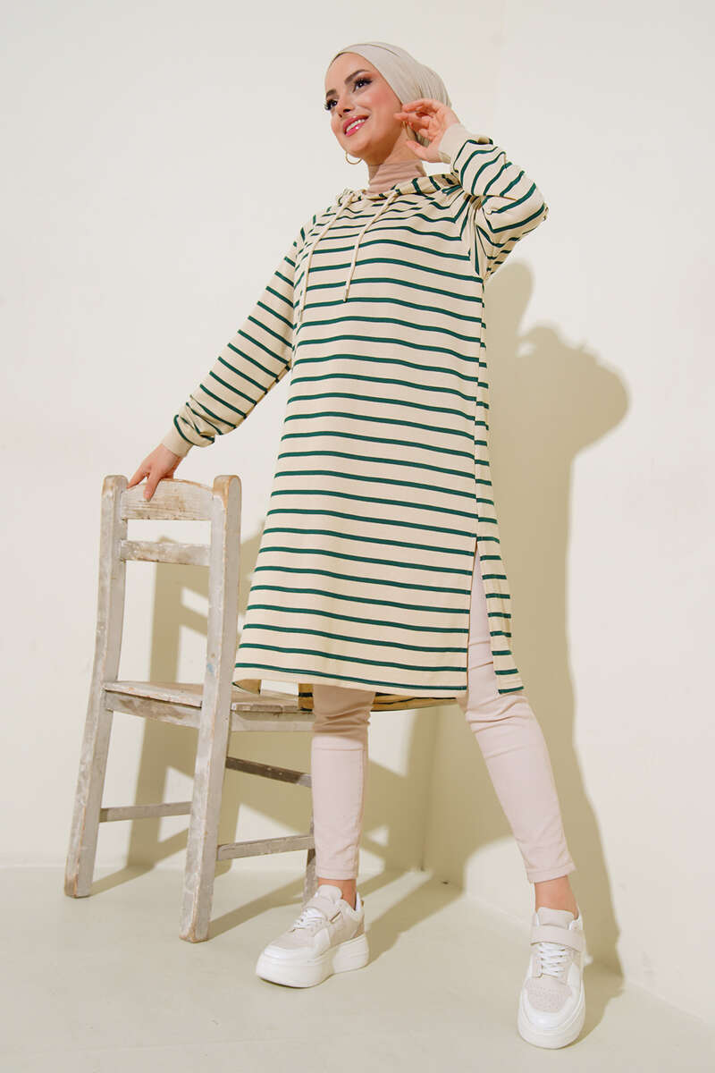 Yeni sezon çizgili trend tuniğimiz kapüşonludur. Kapüşonu ip bağlamalı olan tuniğimizin bilekleri ribanalıdır. Etek uçları her iki yanında yırtmaçlıdır.