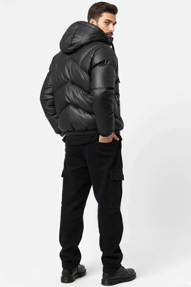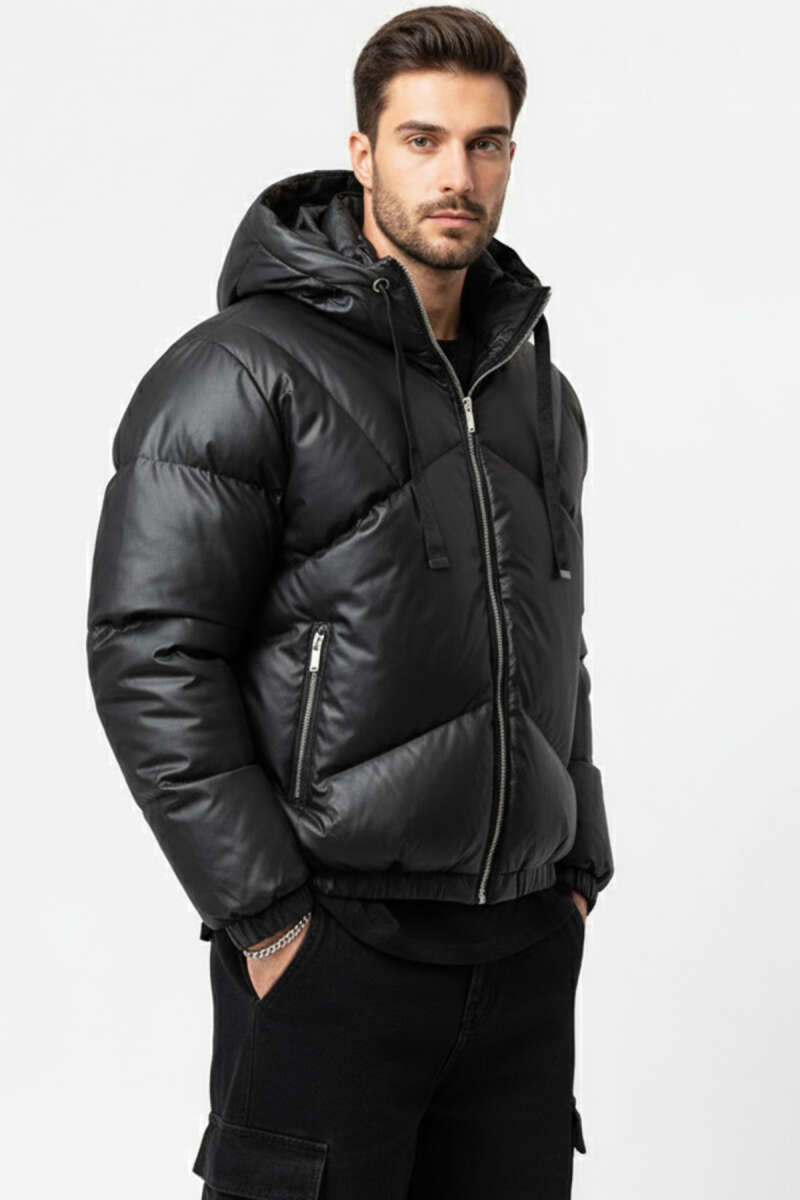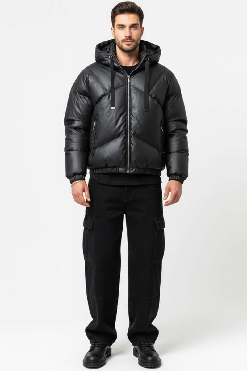 Kapüşonlu Fermuarlı Deri Erkek Mont Siyah