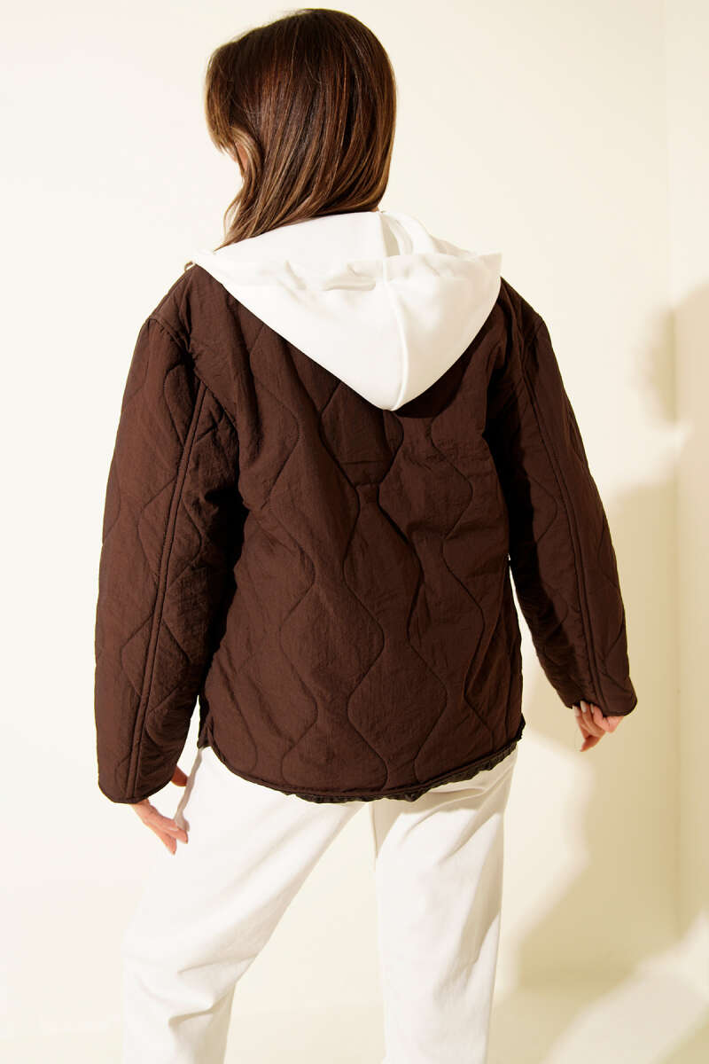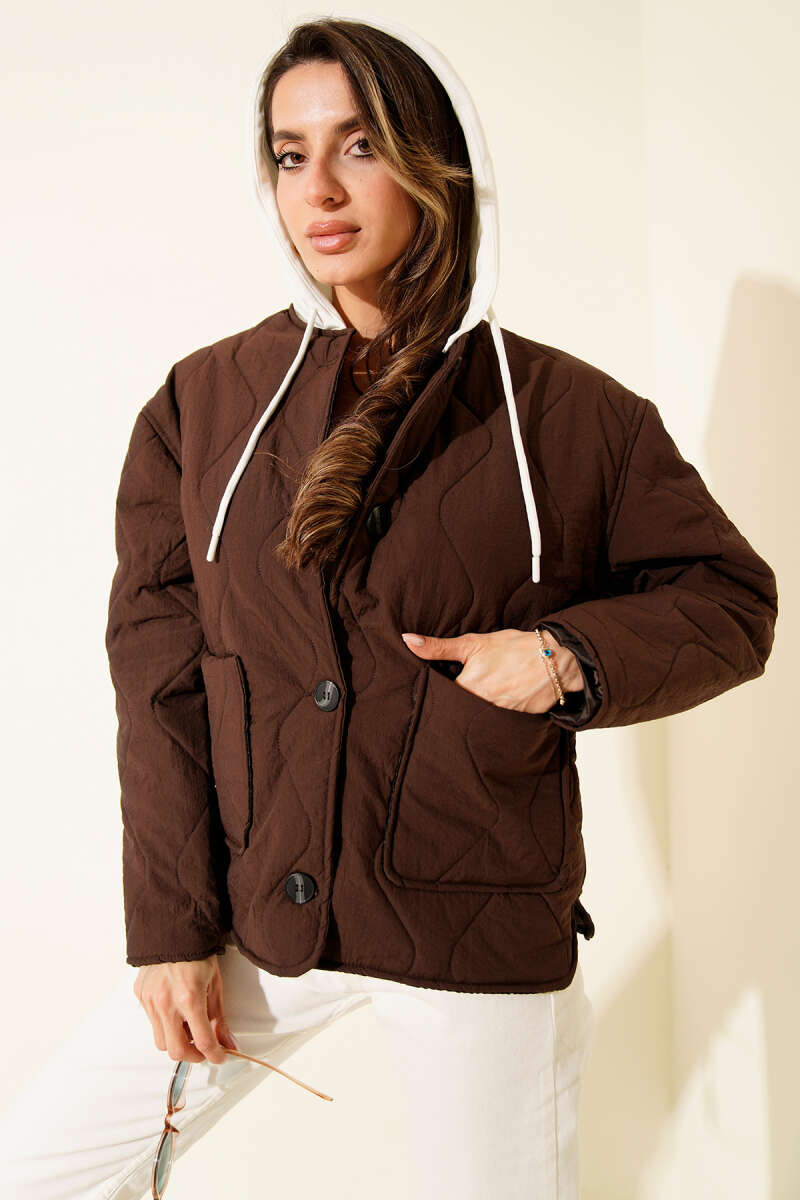 Kapüşonlu Düğmeli Kapitone Ceket Kahve