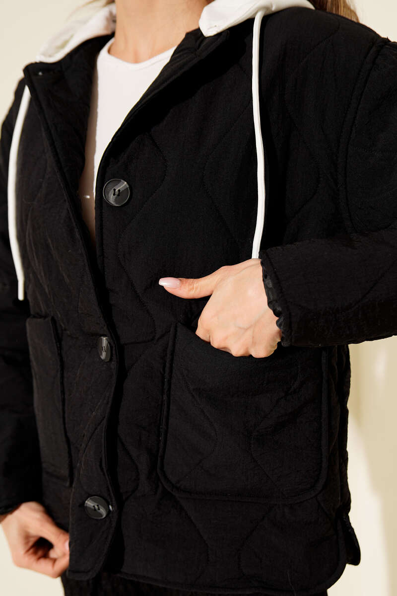 Kapüşonlu Düğmeli Kapitone Ceket Siyah