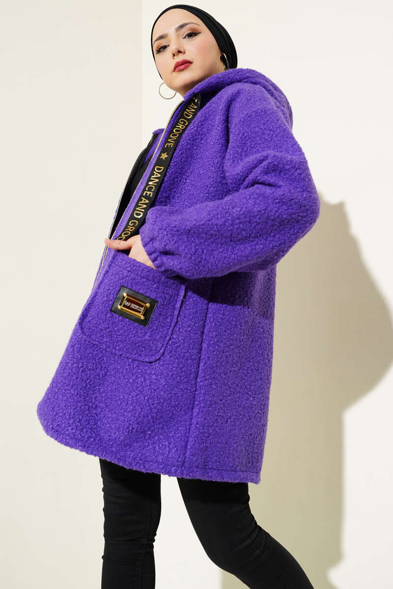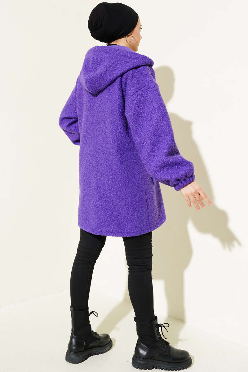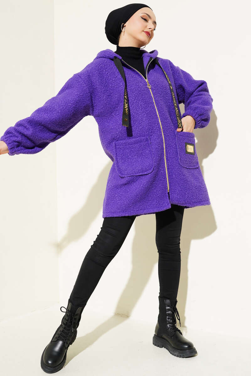 Kapüşonlu Fermuarlı Buklet Kaban Mor