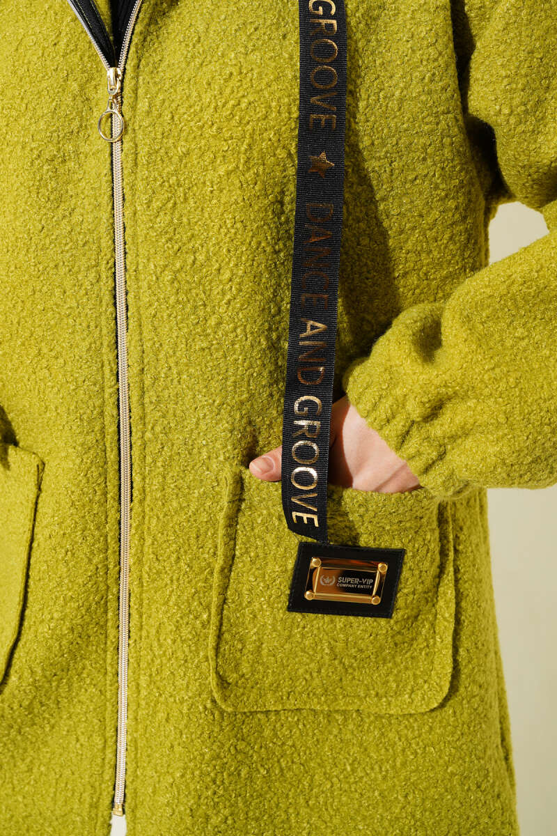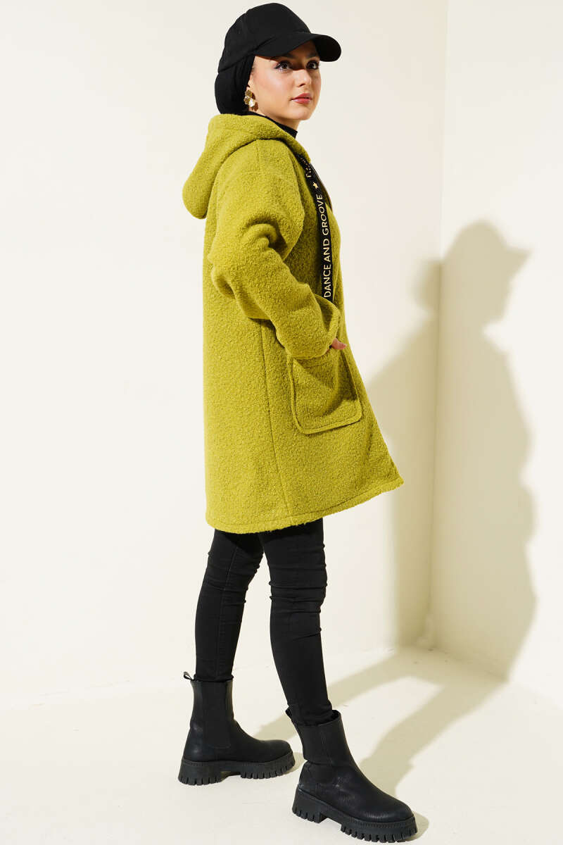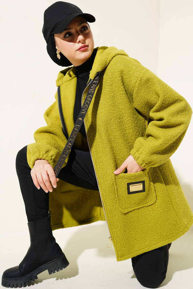 Kapüşonlu Fermuarlı Buklet Kaban Yağ Yeşili