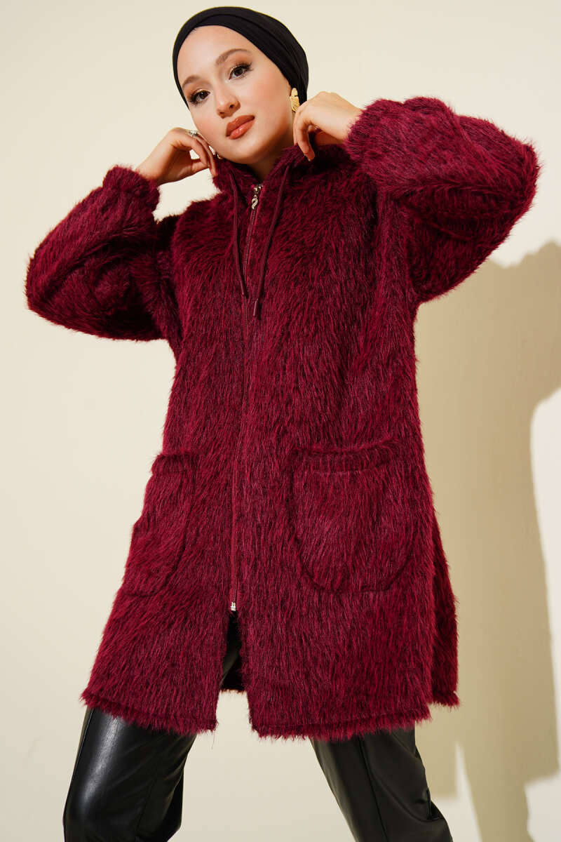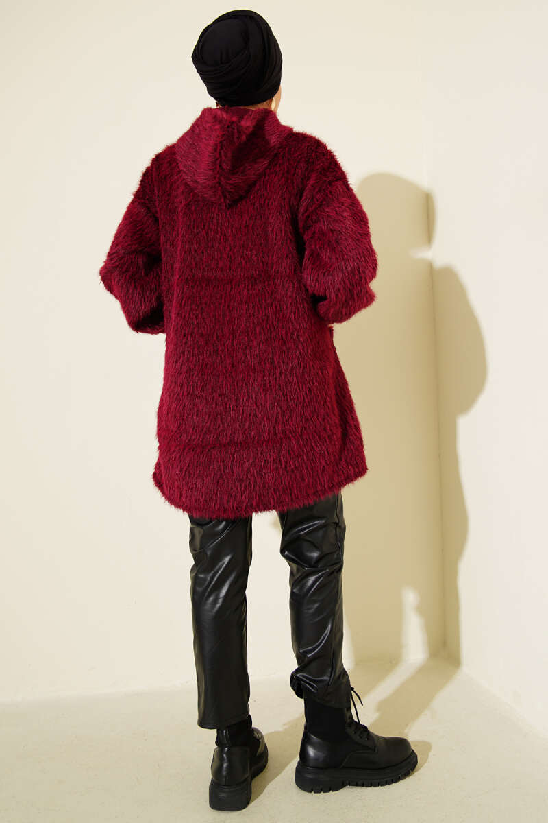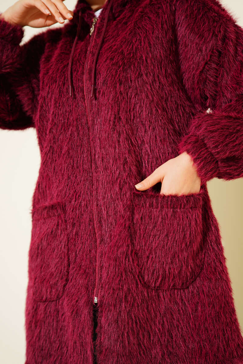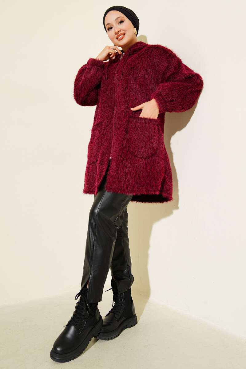 Kapüşonlu Fermuarlı Cepli Hırka Bordo