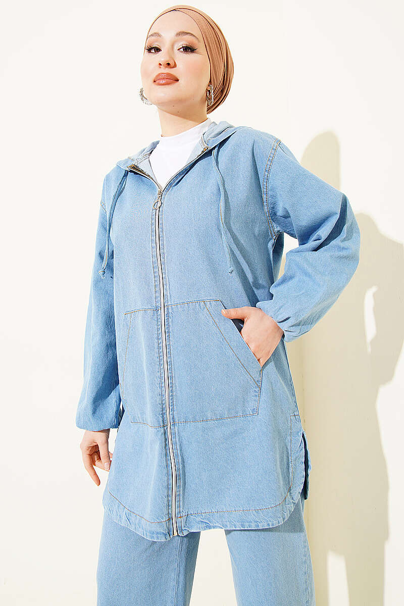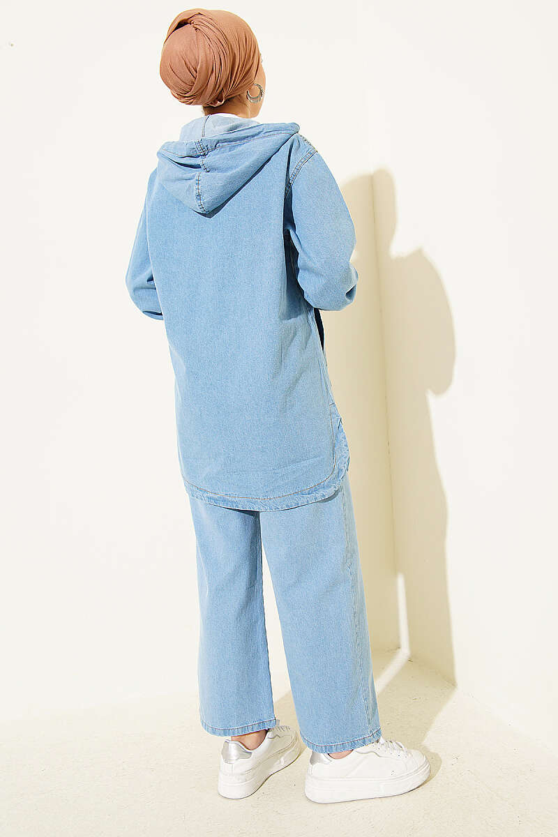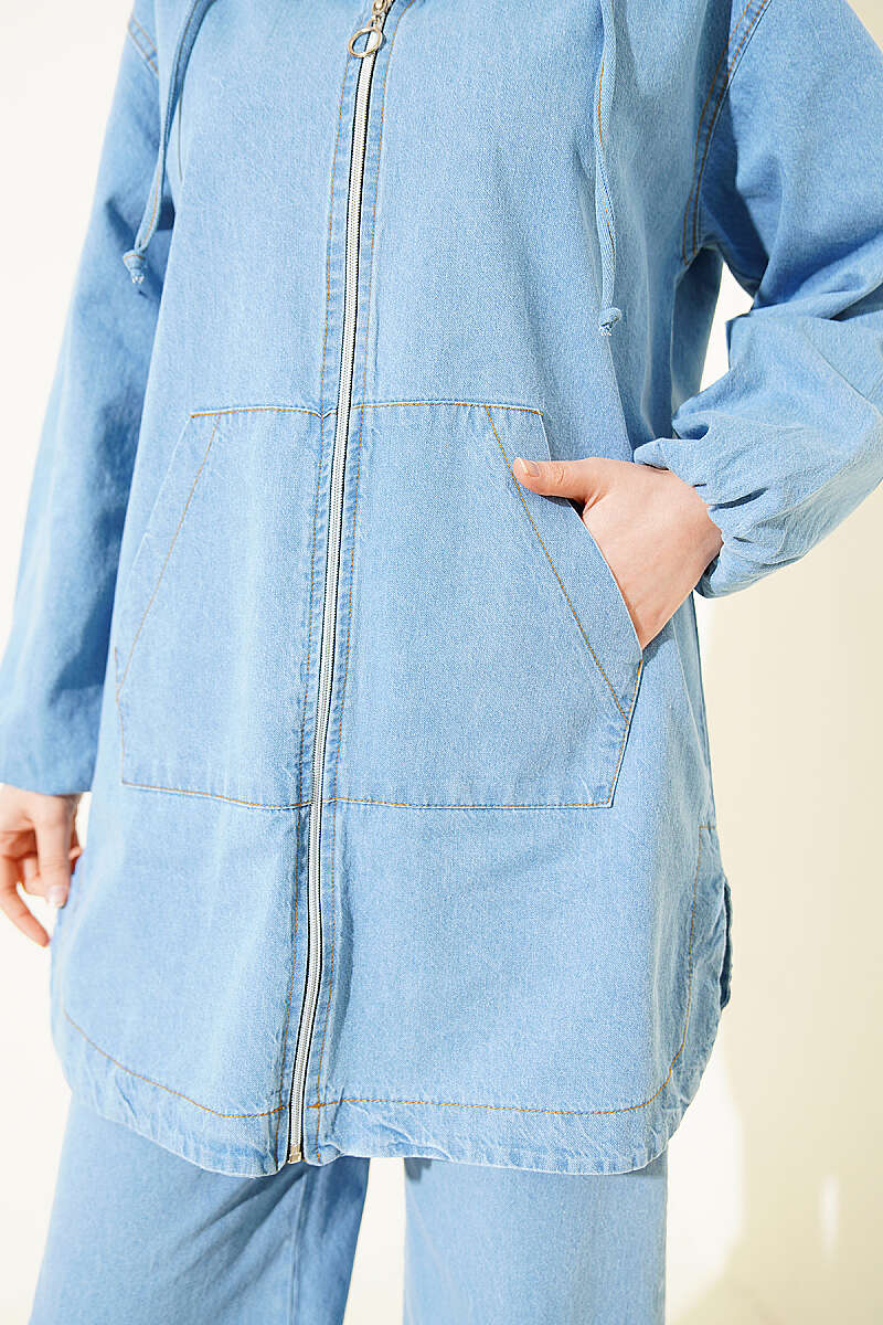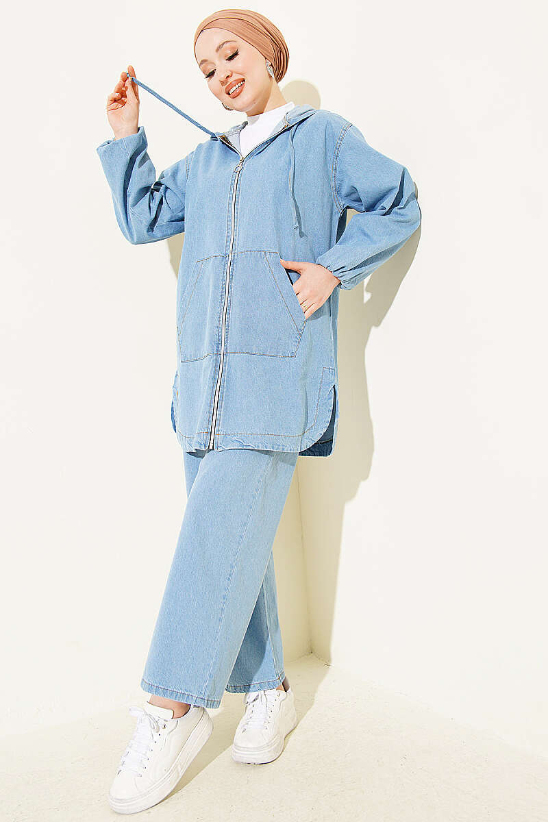 Kapüşonlu Fermuarlı Cepli Kot Takım Açık Mavi
