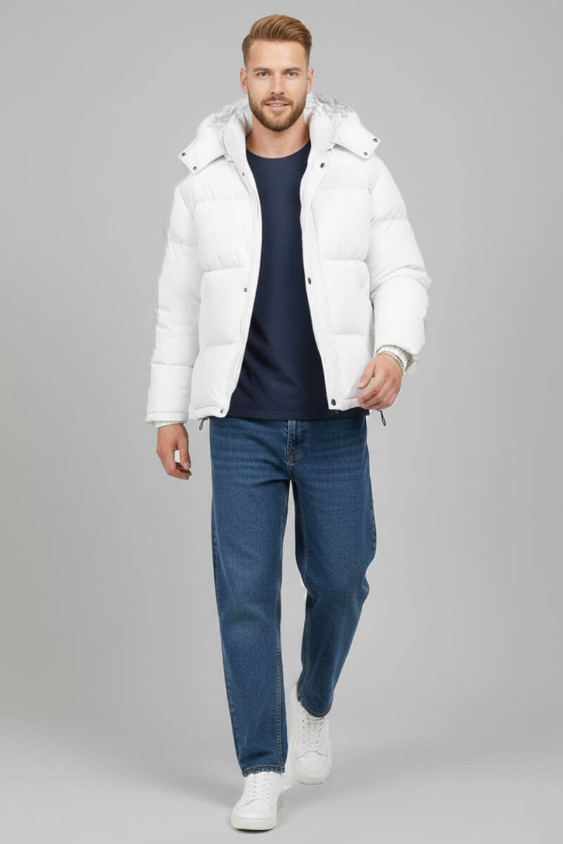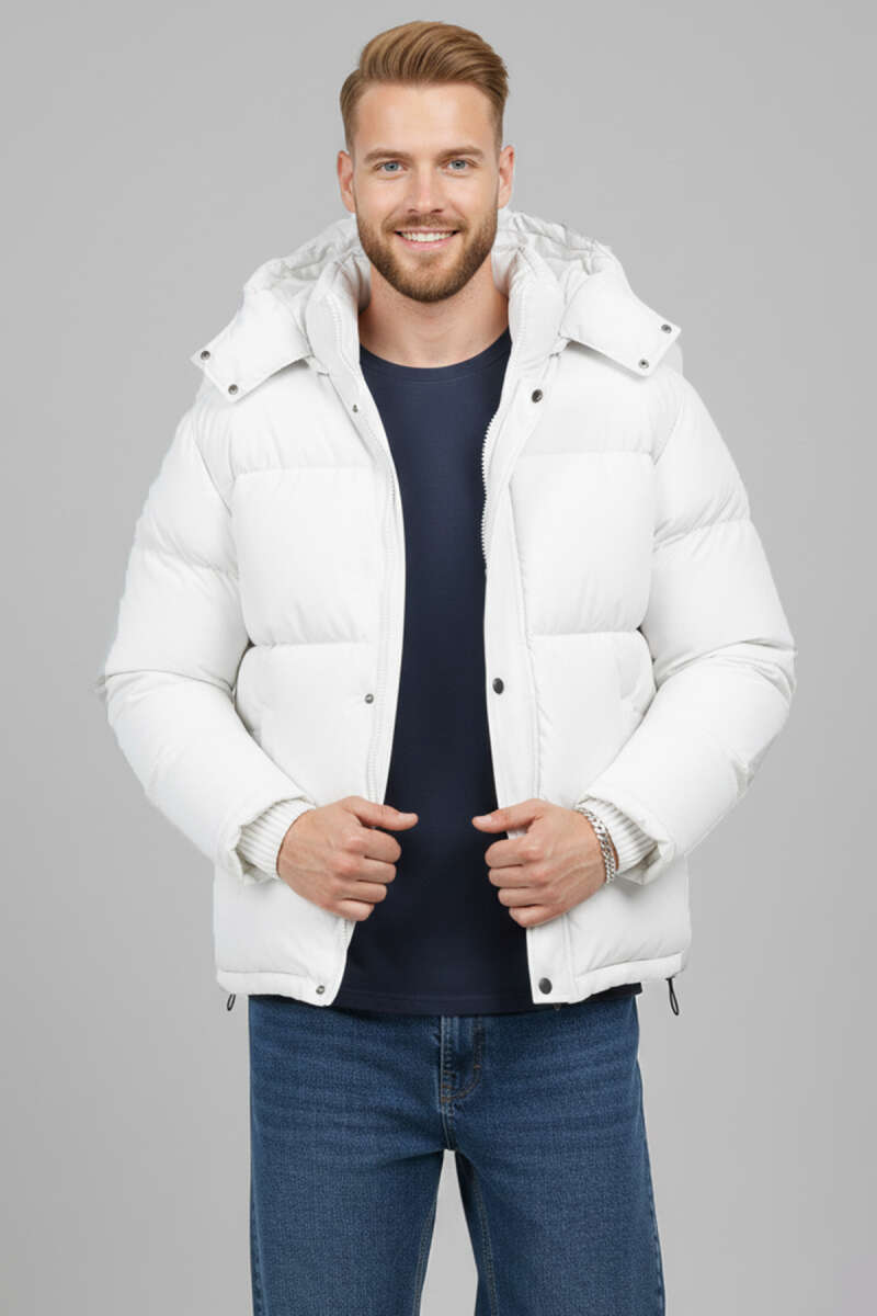 Kapüşonlu Fermuarlı Erkek Şişme Mont Beyaz