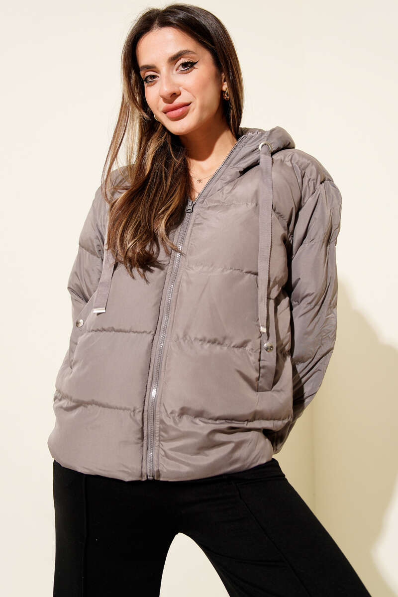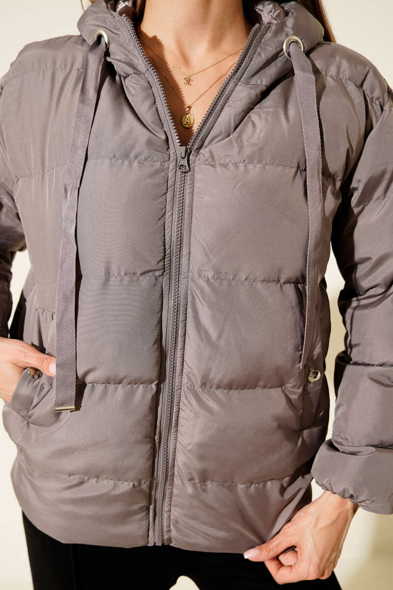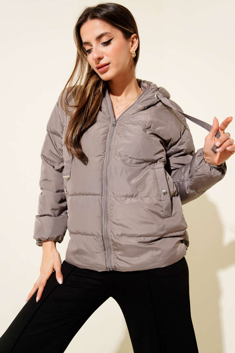 Kapüşonlu Fermuarlı Kısa Şişme Mont Vizon