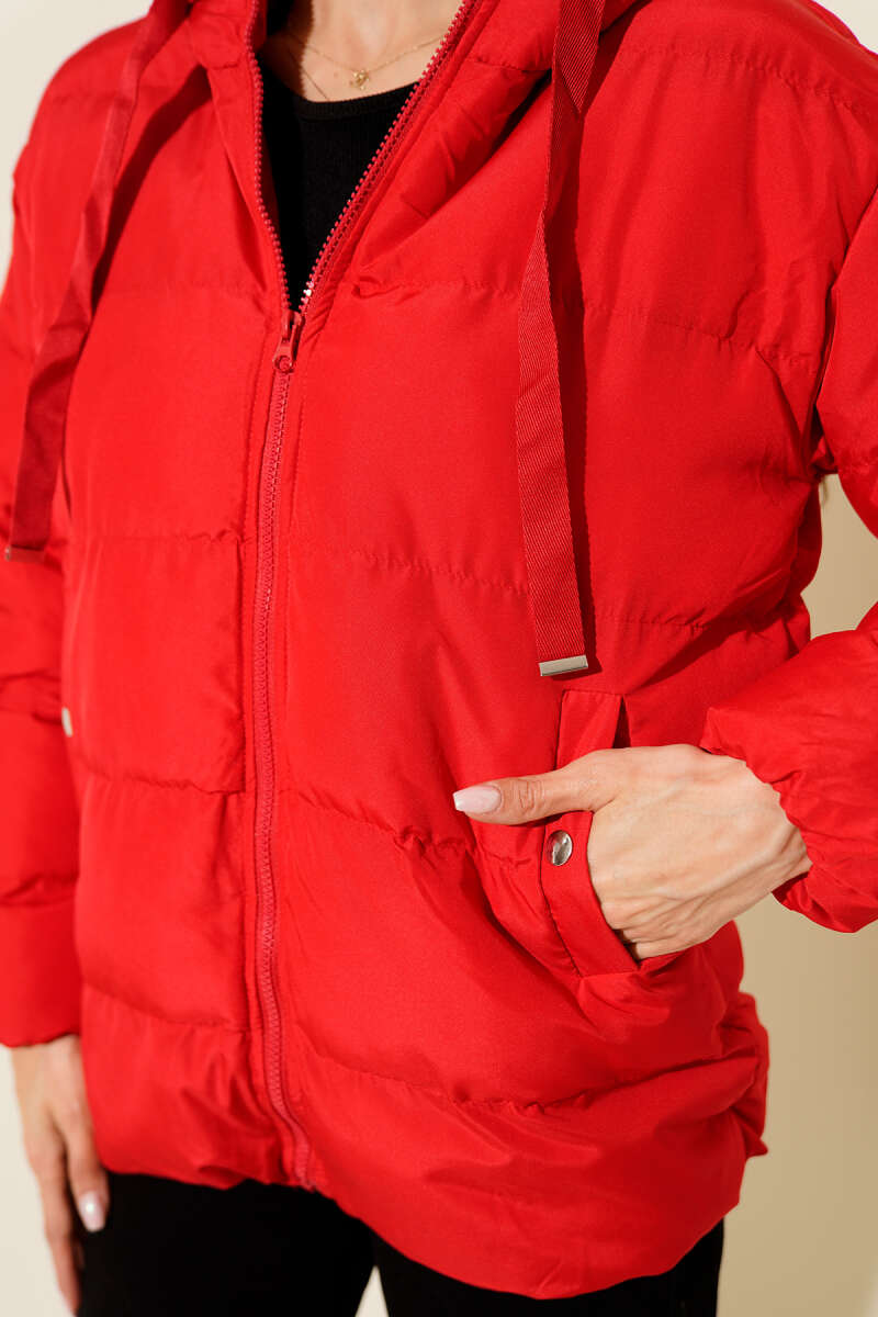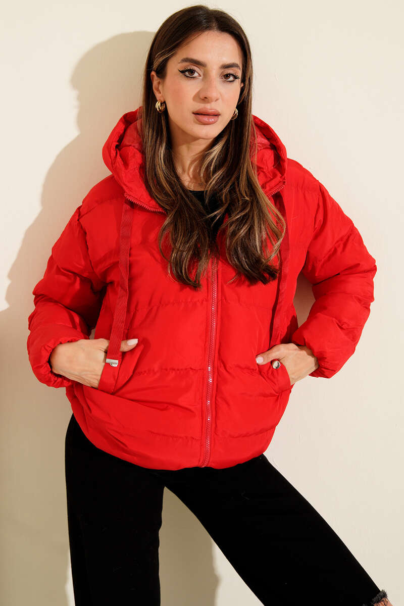 Kapüşonlu Fermuarlı Kısa Şişme Mont Kırmızı