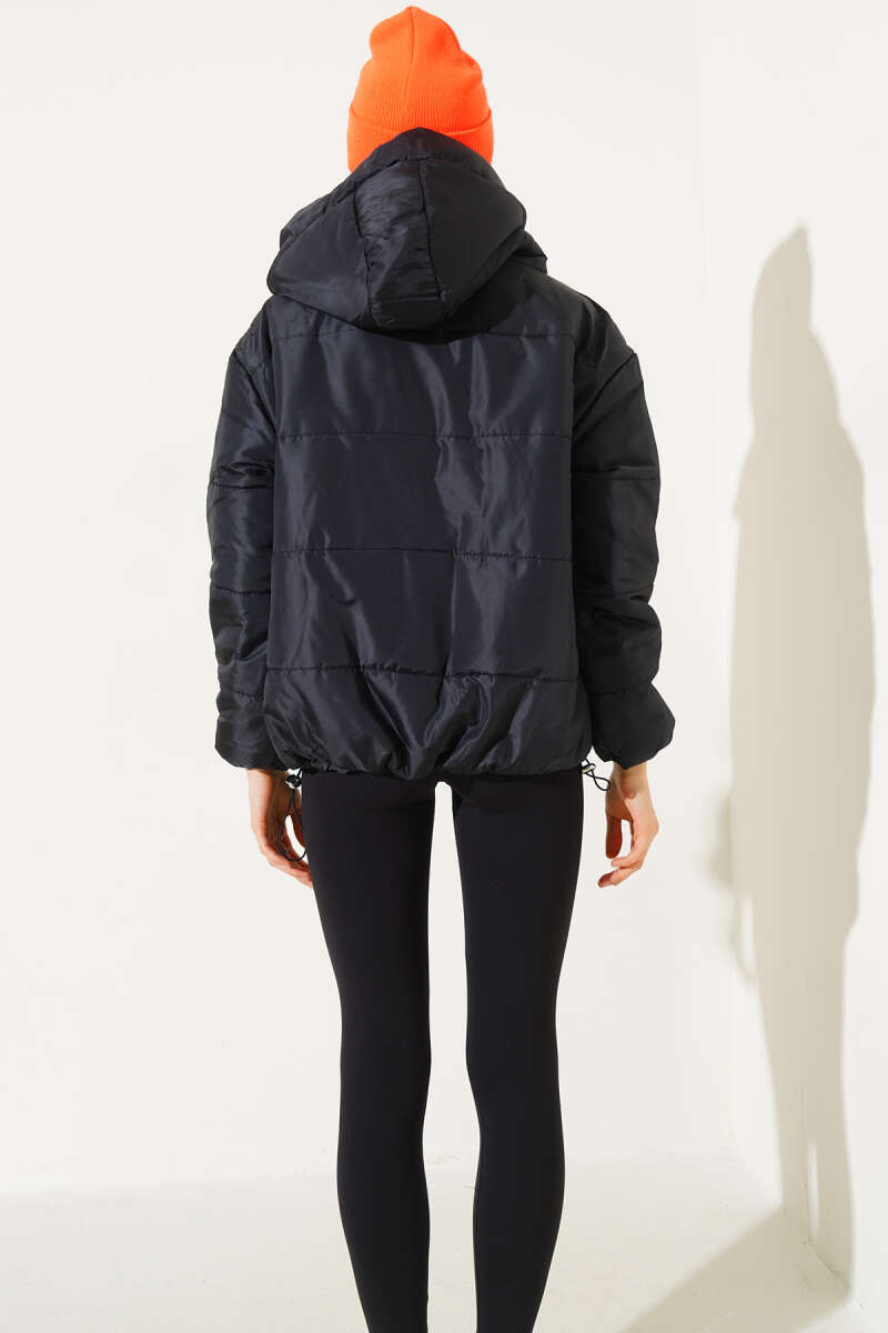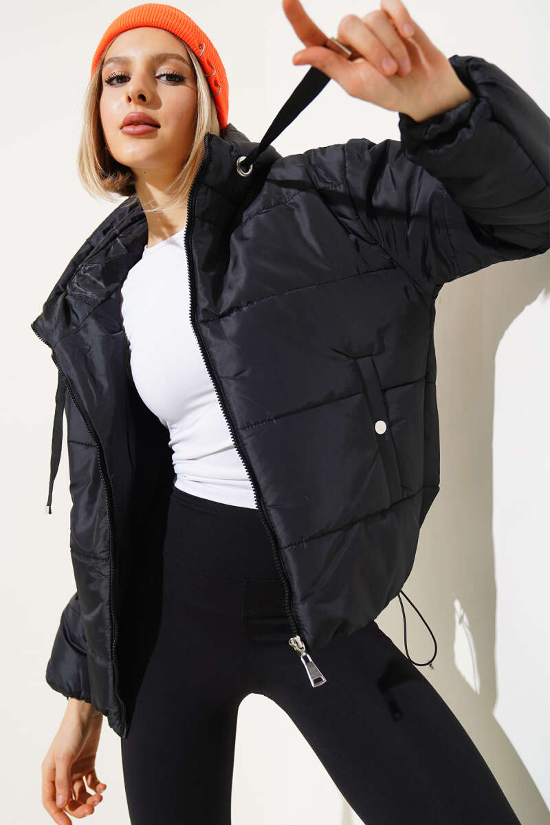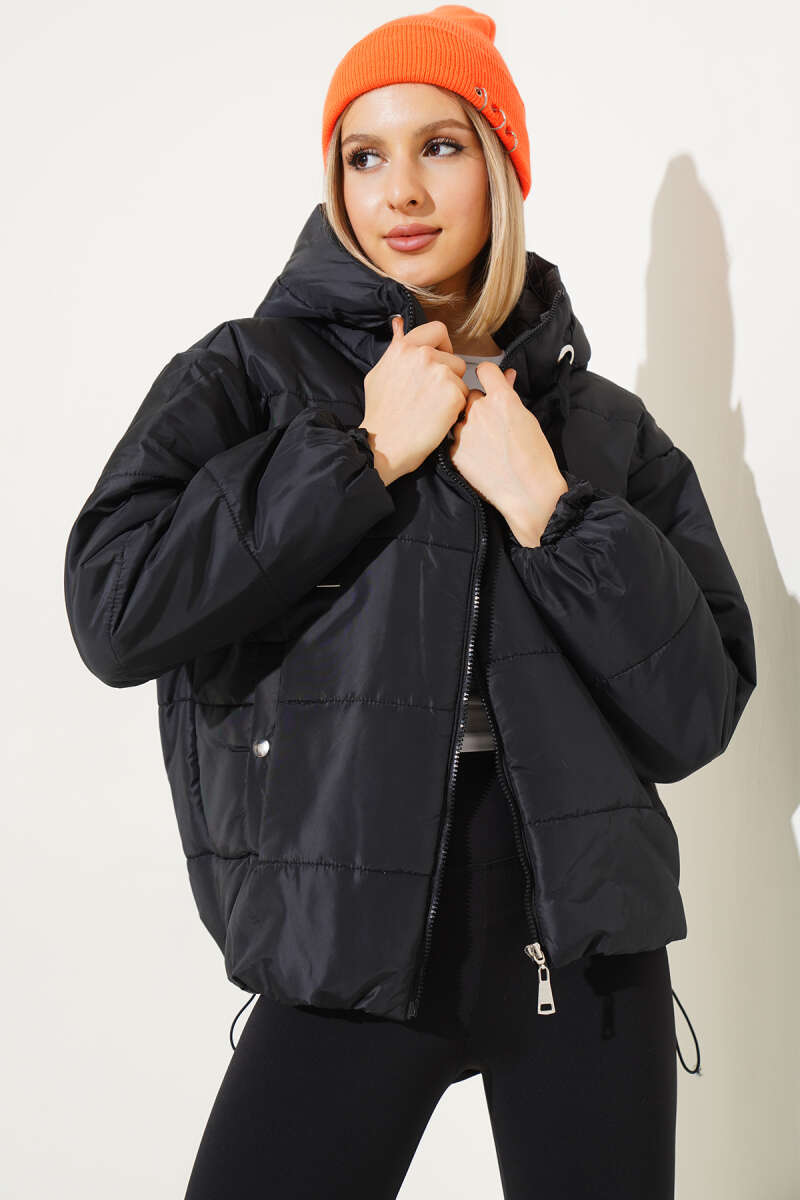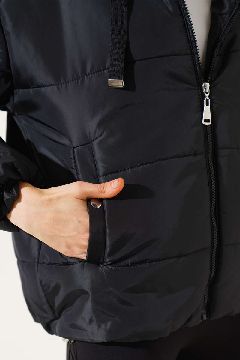 Kapüşonlu Fermuarlı Kısa Şişme Mont Siyah