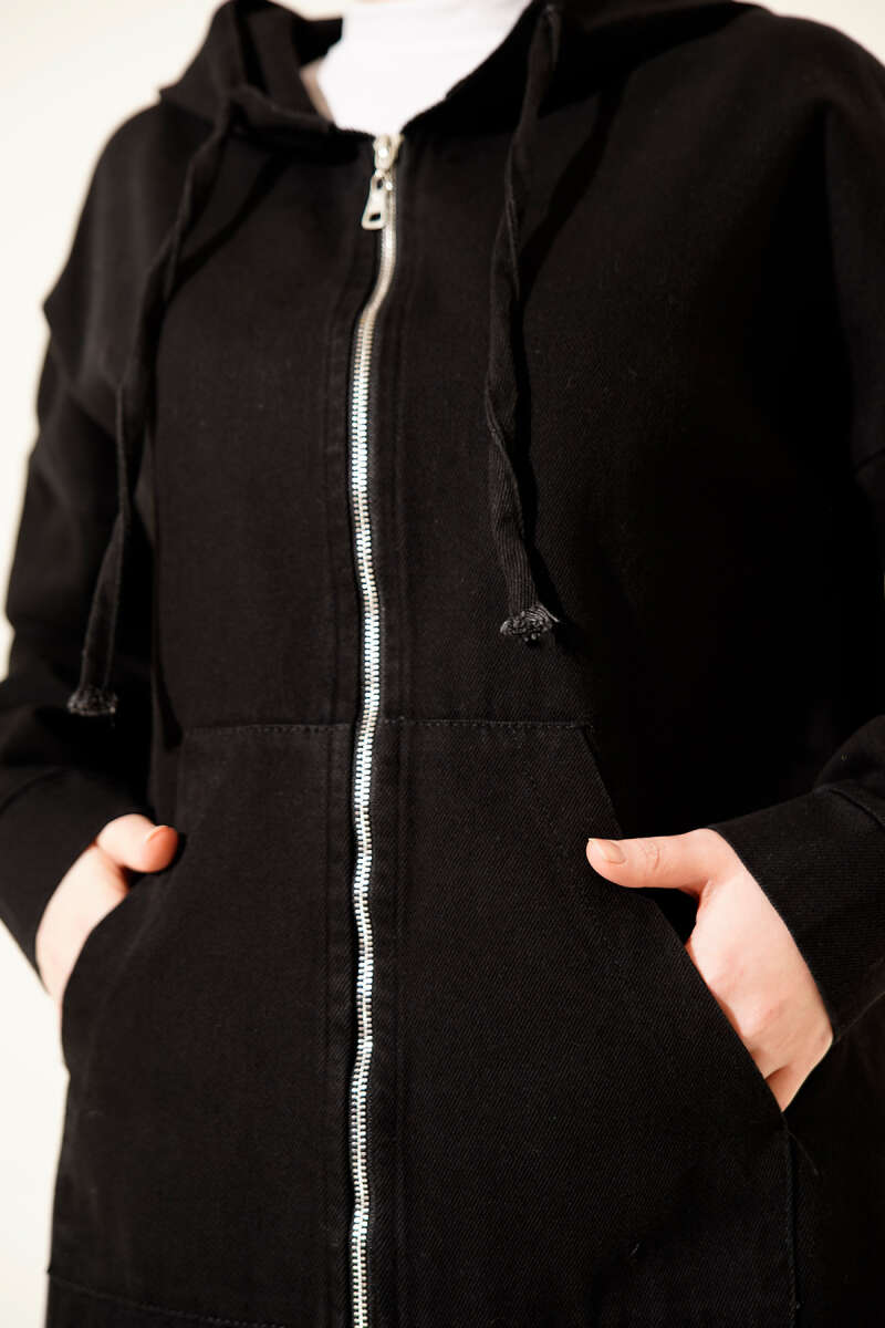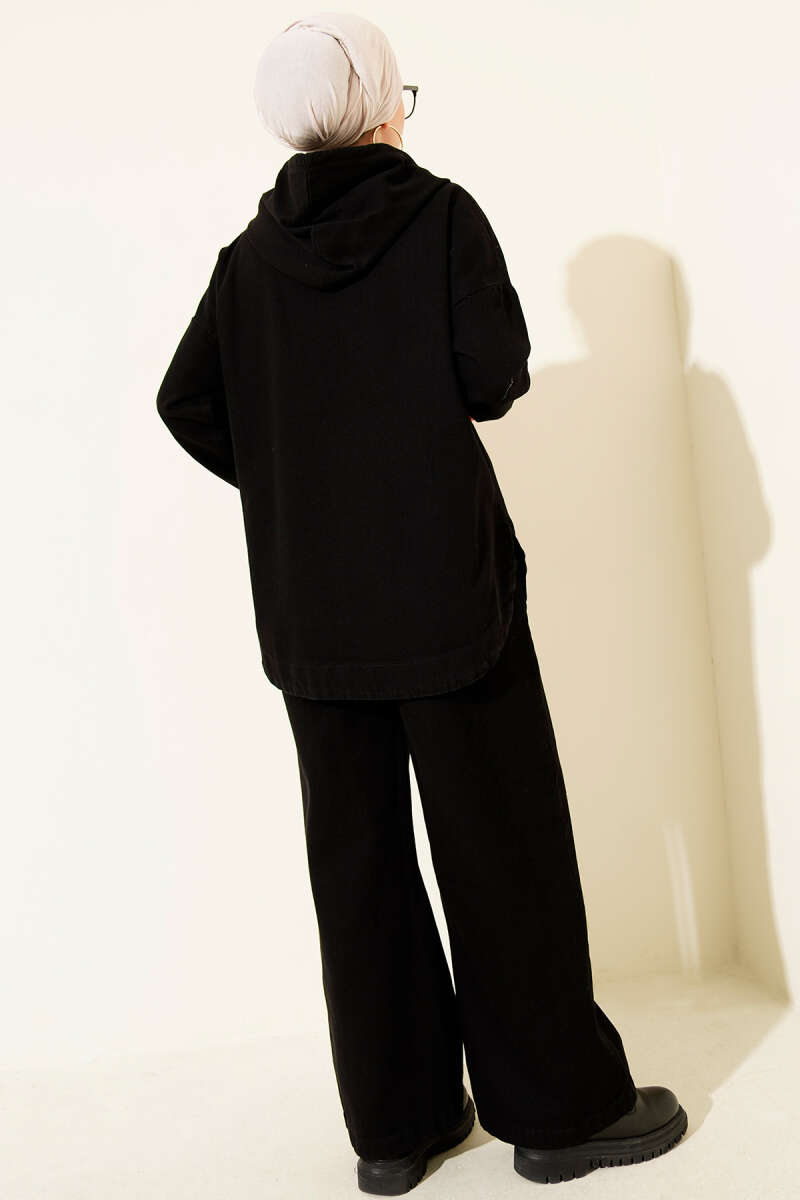 Kapüşonlu Fermuarlı Kot İkili Takım Siyah
