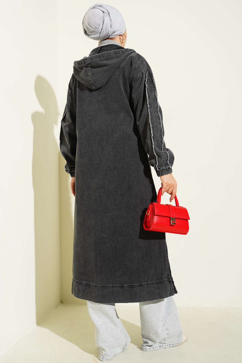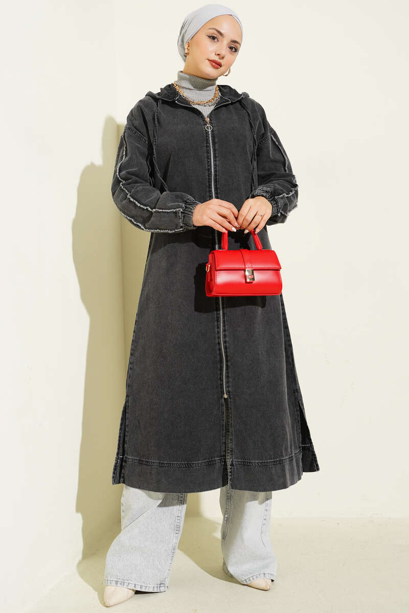 Bilek Apoletli Kuşaklı Tay Tüyü Kaban Siyah