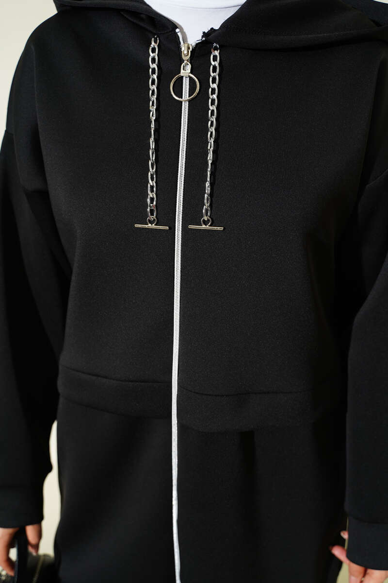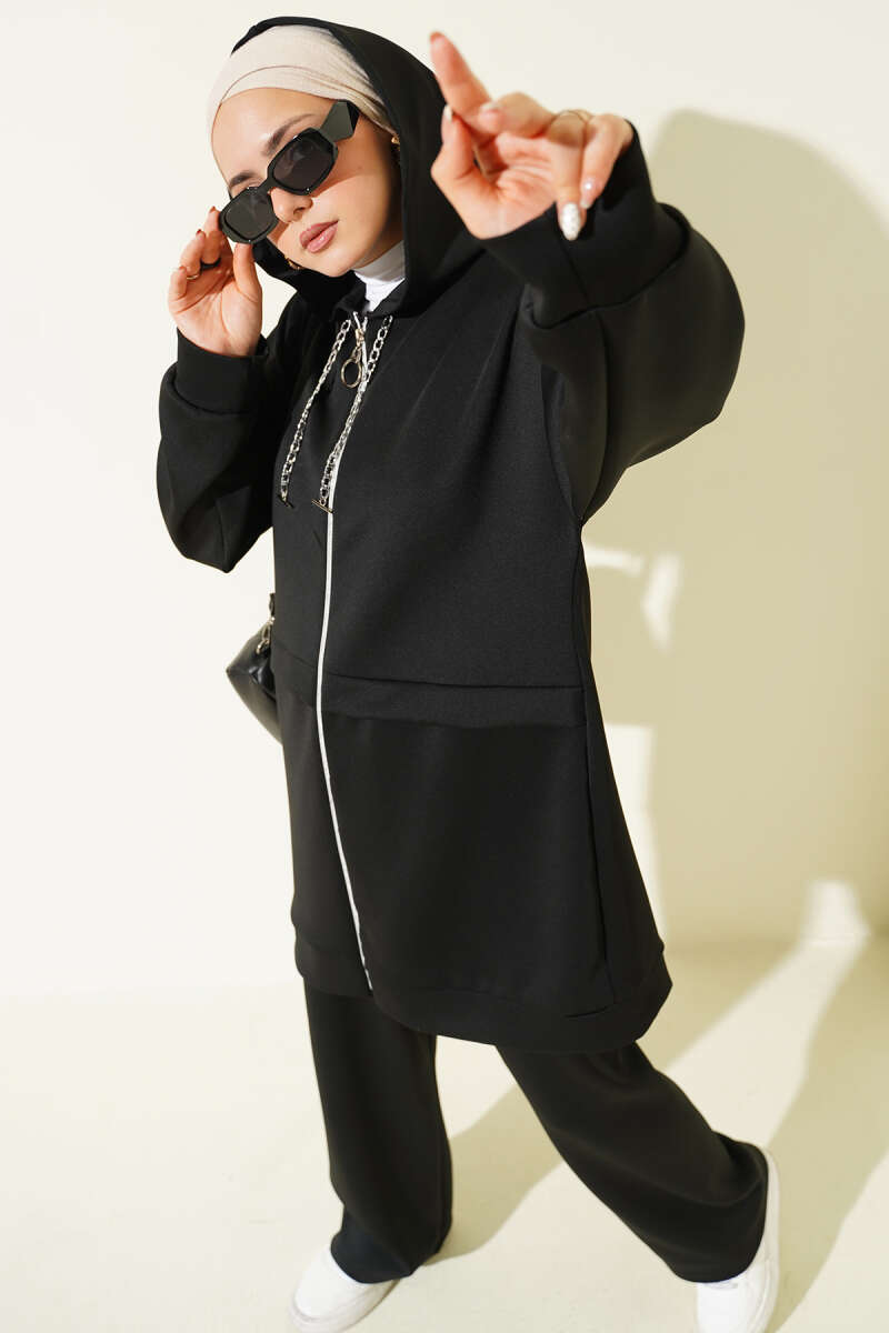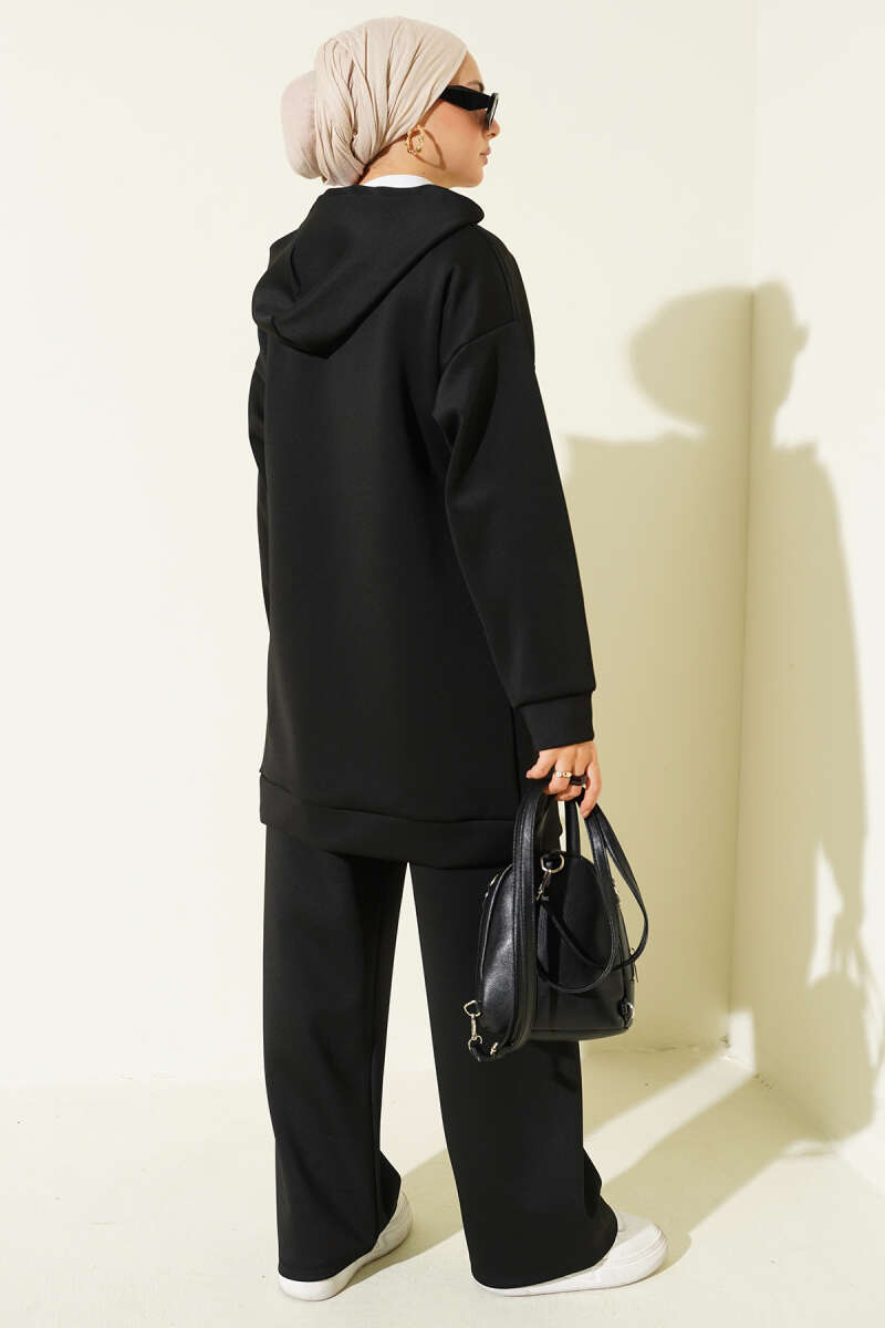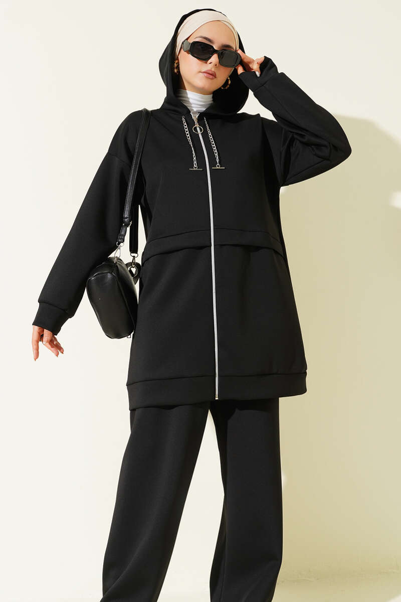 Kapüşonlu Fermuarlı Scuba İkili Takım Siyah