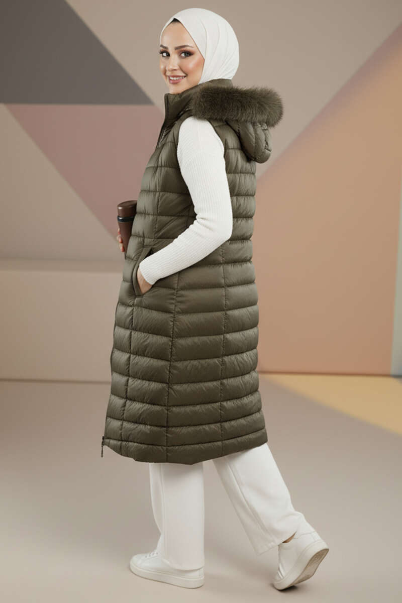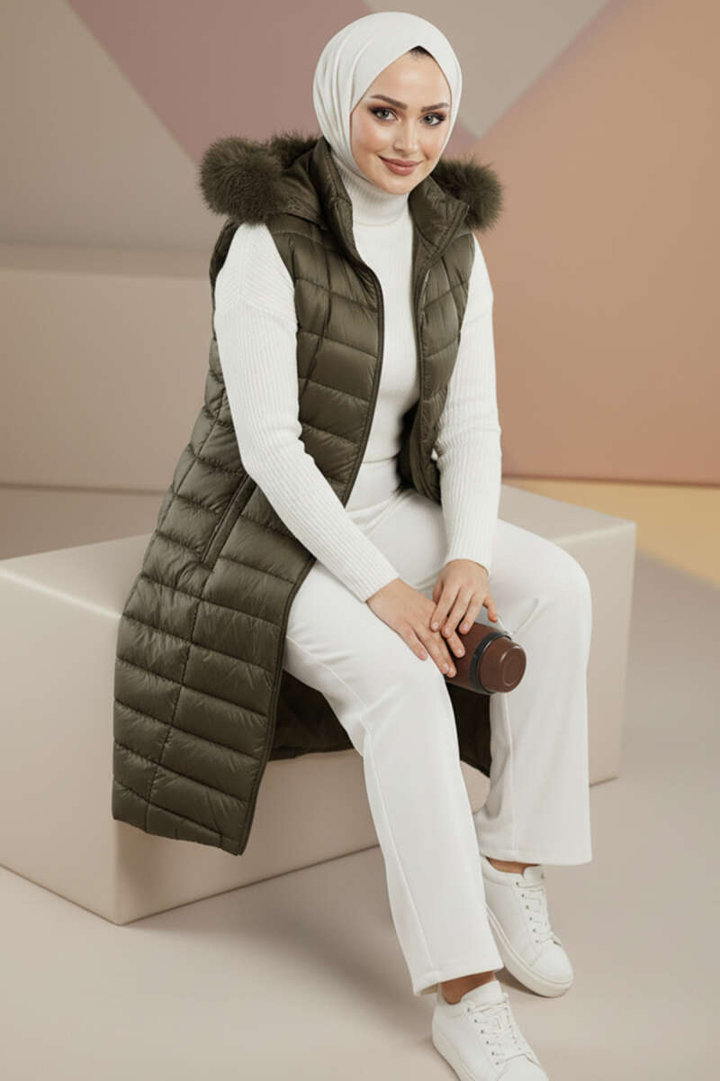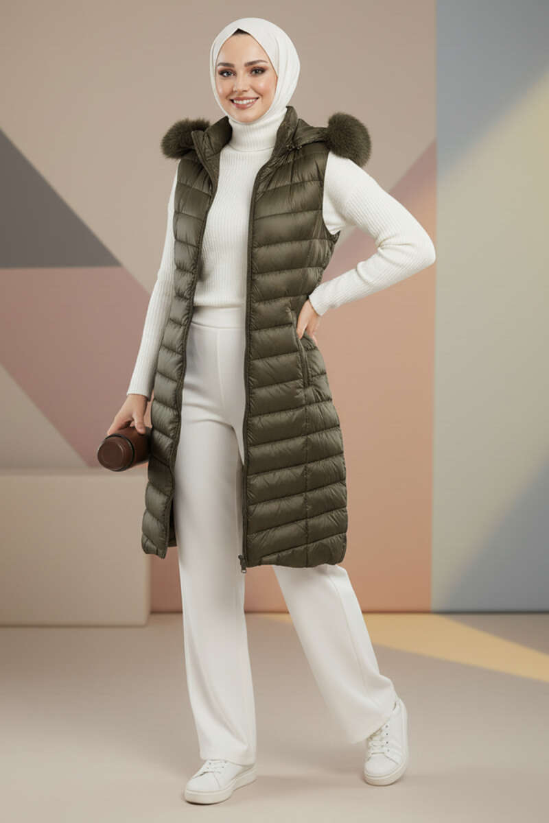 Kapüşonlu Fermuarlı Şişme Yelek Vizon