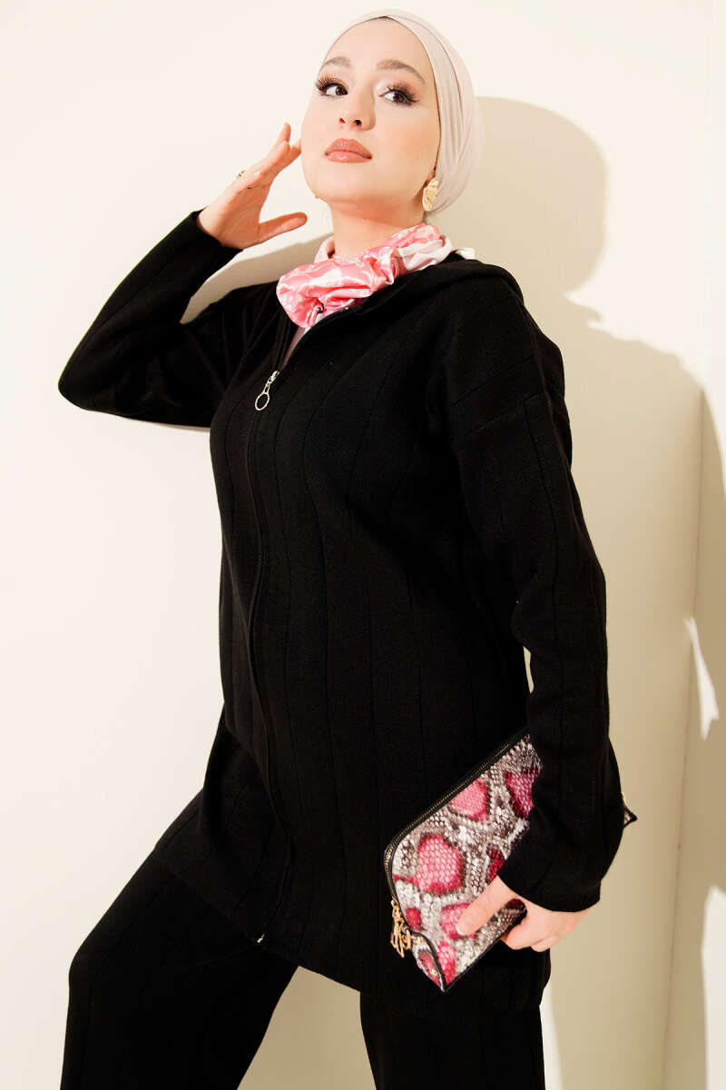 Kapüşonlu Fermuarlı Triko İkili Takım Füme