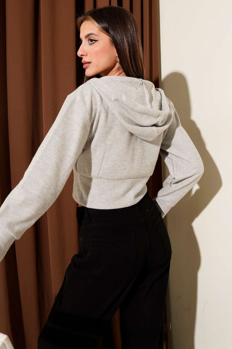 Kapüşonlu Fitilli Kısa Hırka Gri