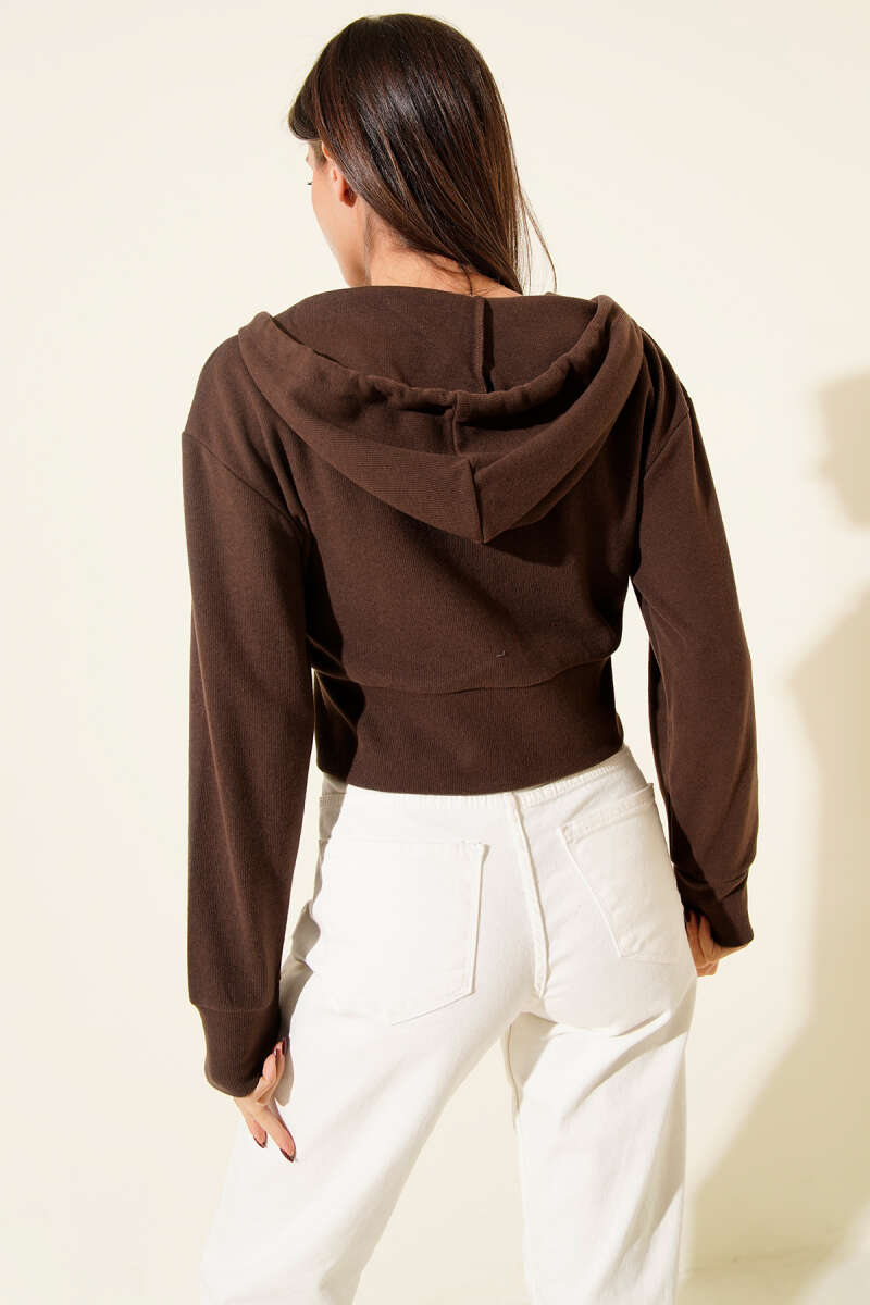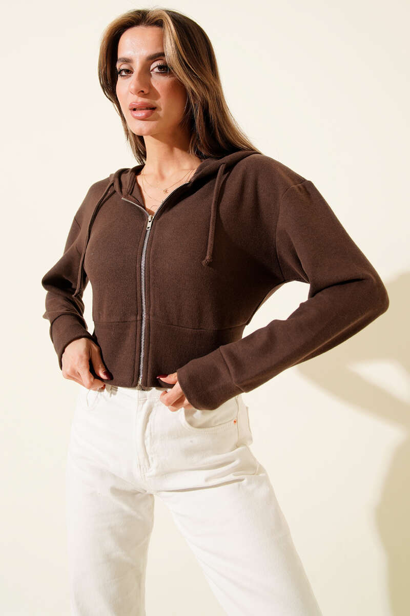 Kapüşonlu Fitilli Kısa Hırka Kahve