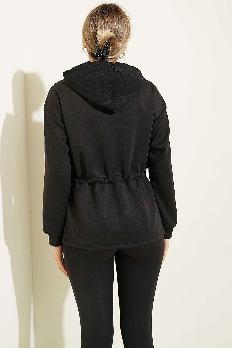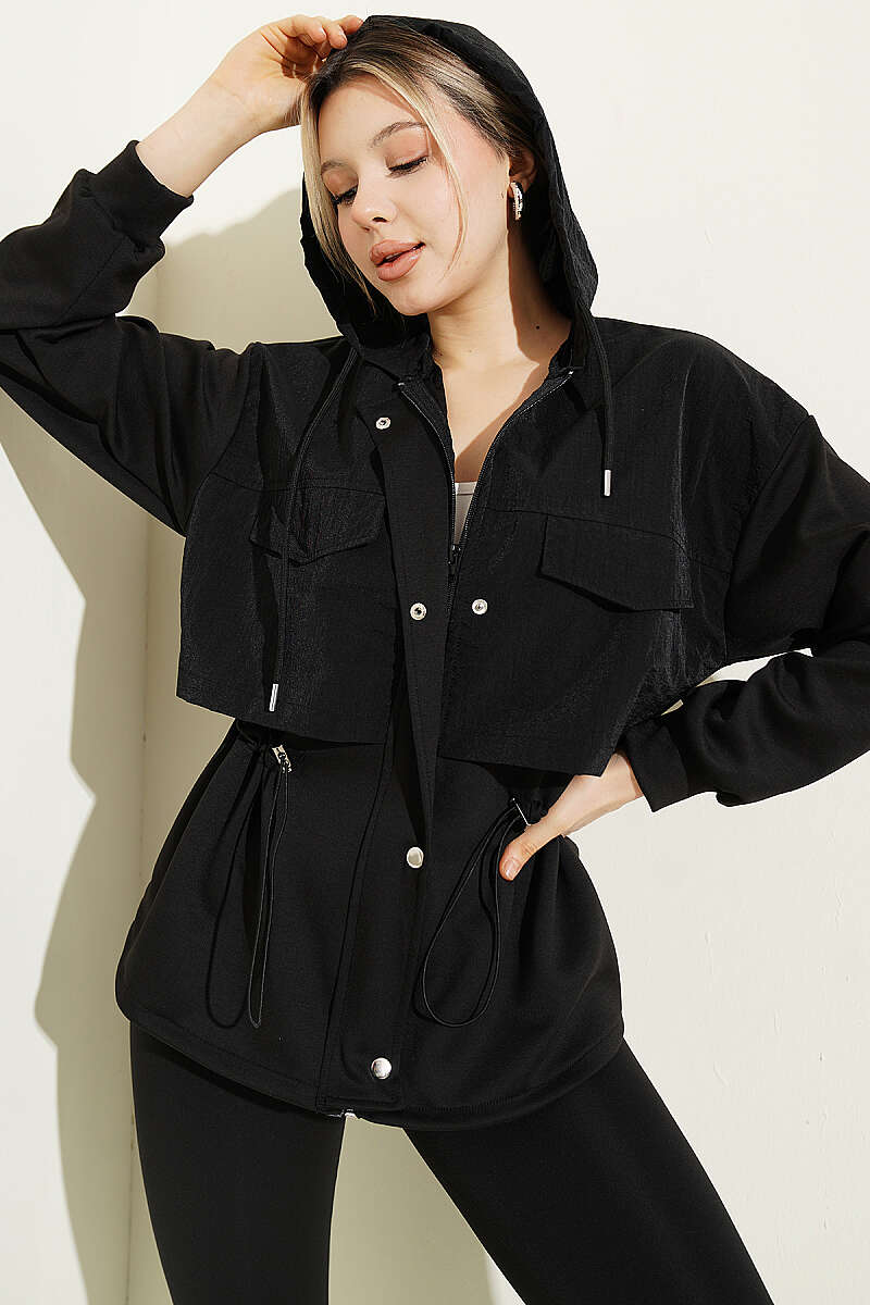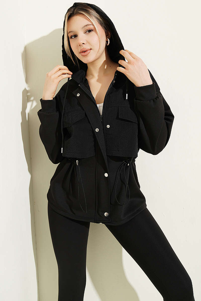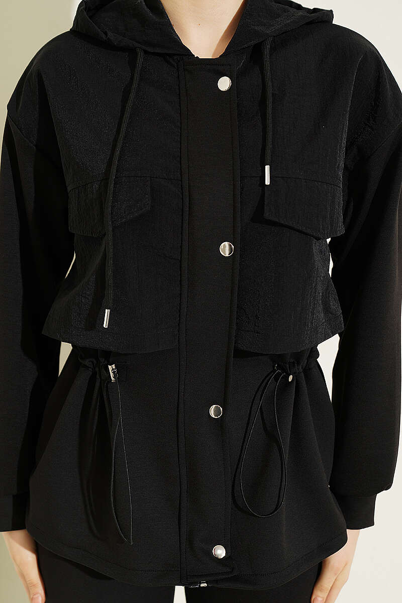 Kapüşonlu Garni Detaylı Ceket Siyah