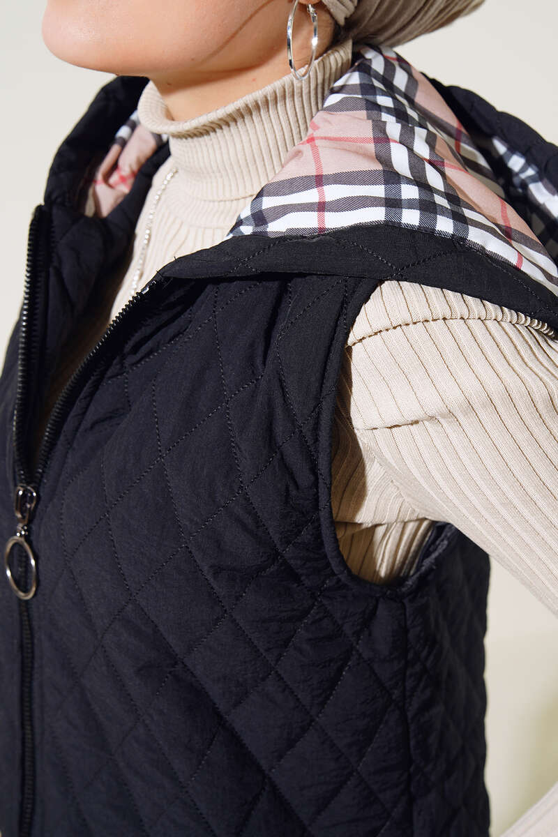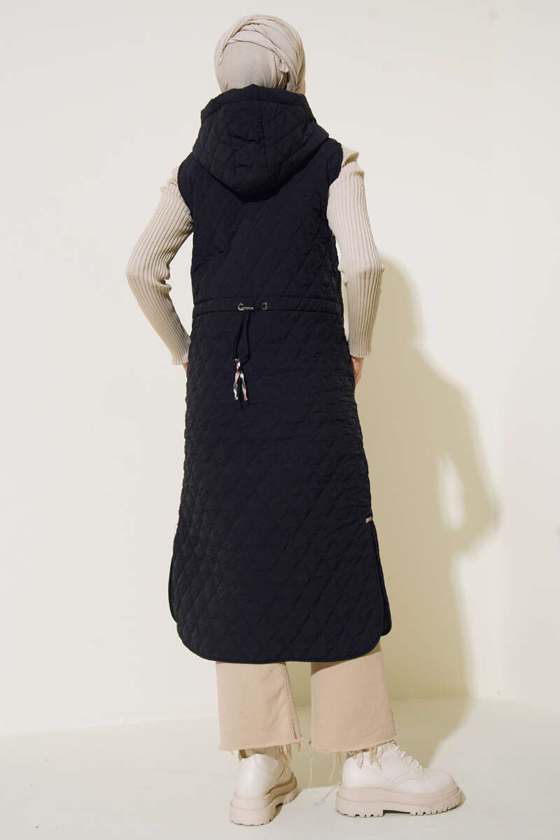 Kapüşonlu Kapitone Uzun Yelek Siyah