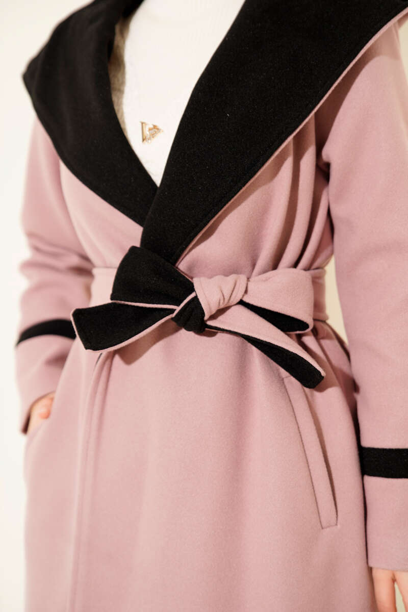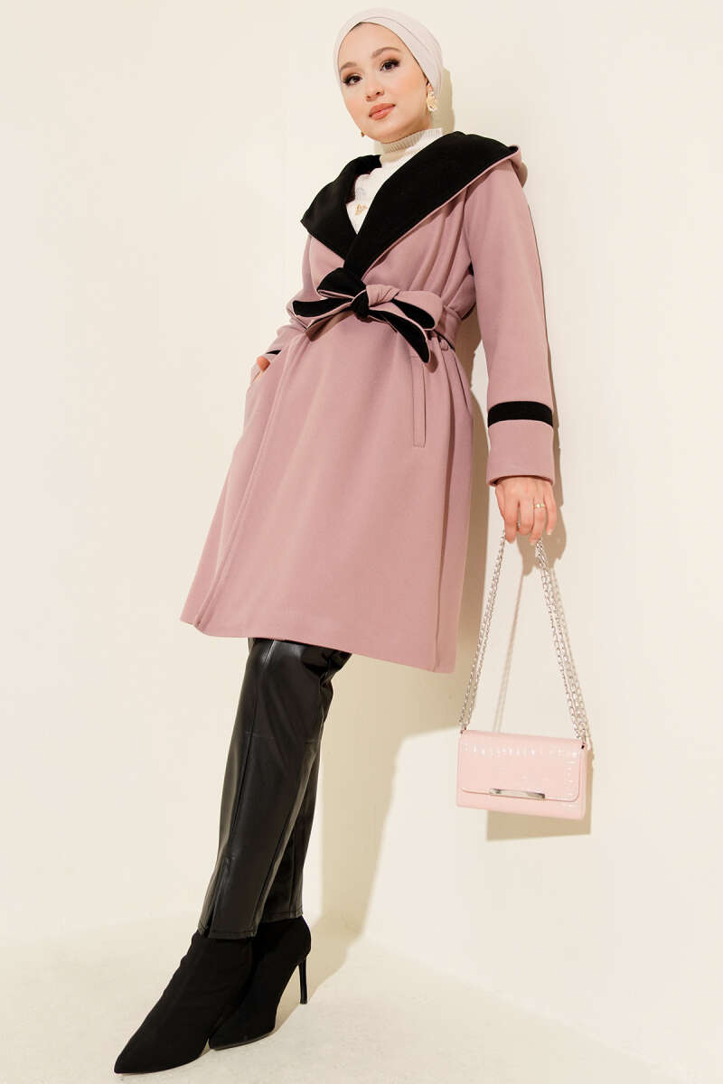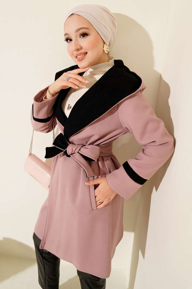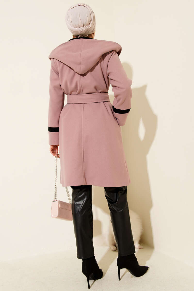 Kapüşonlu Kuşaklı Kaşe Kaban Pudra