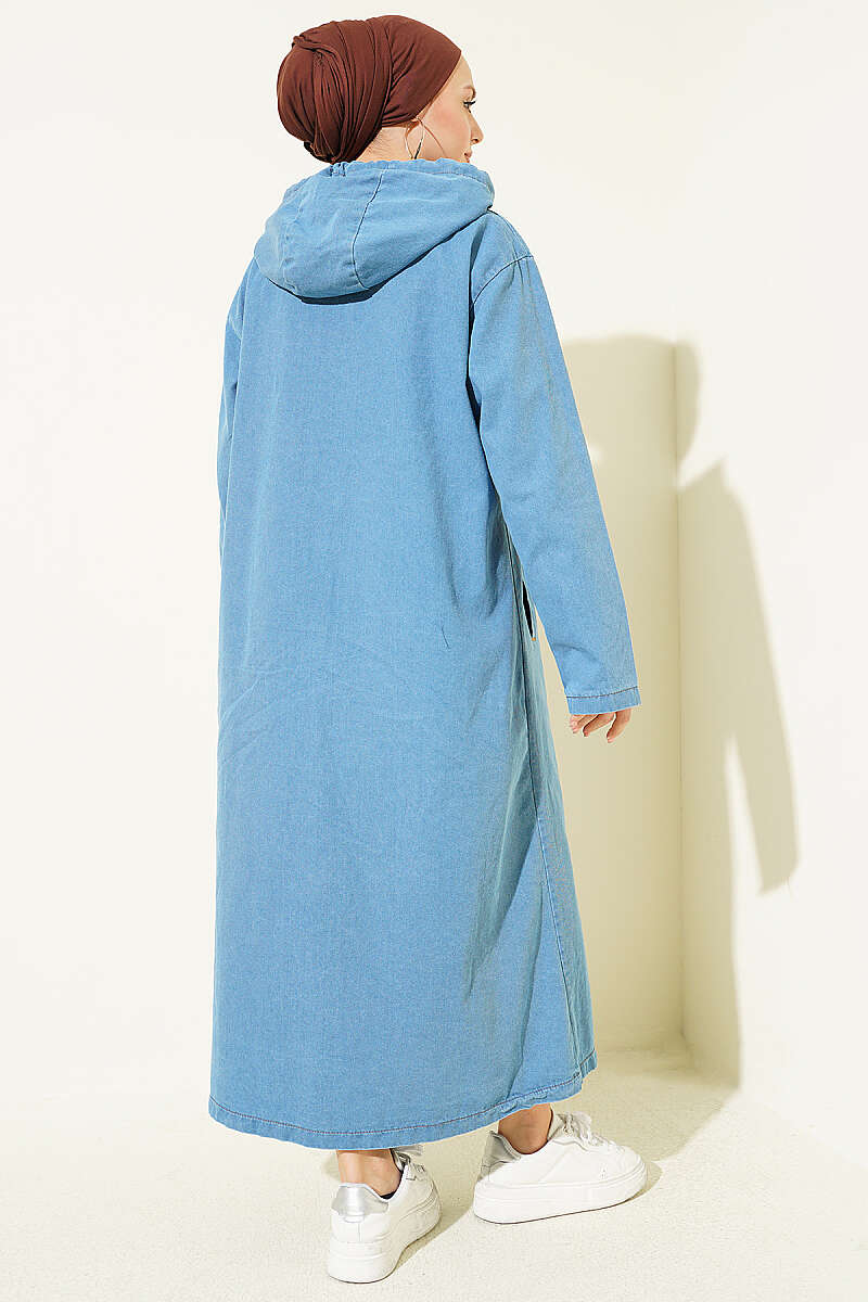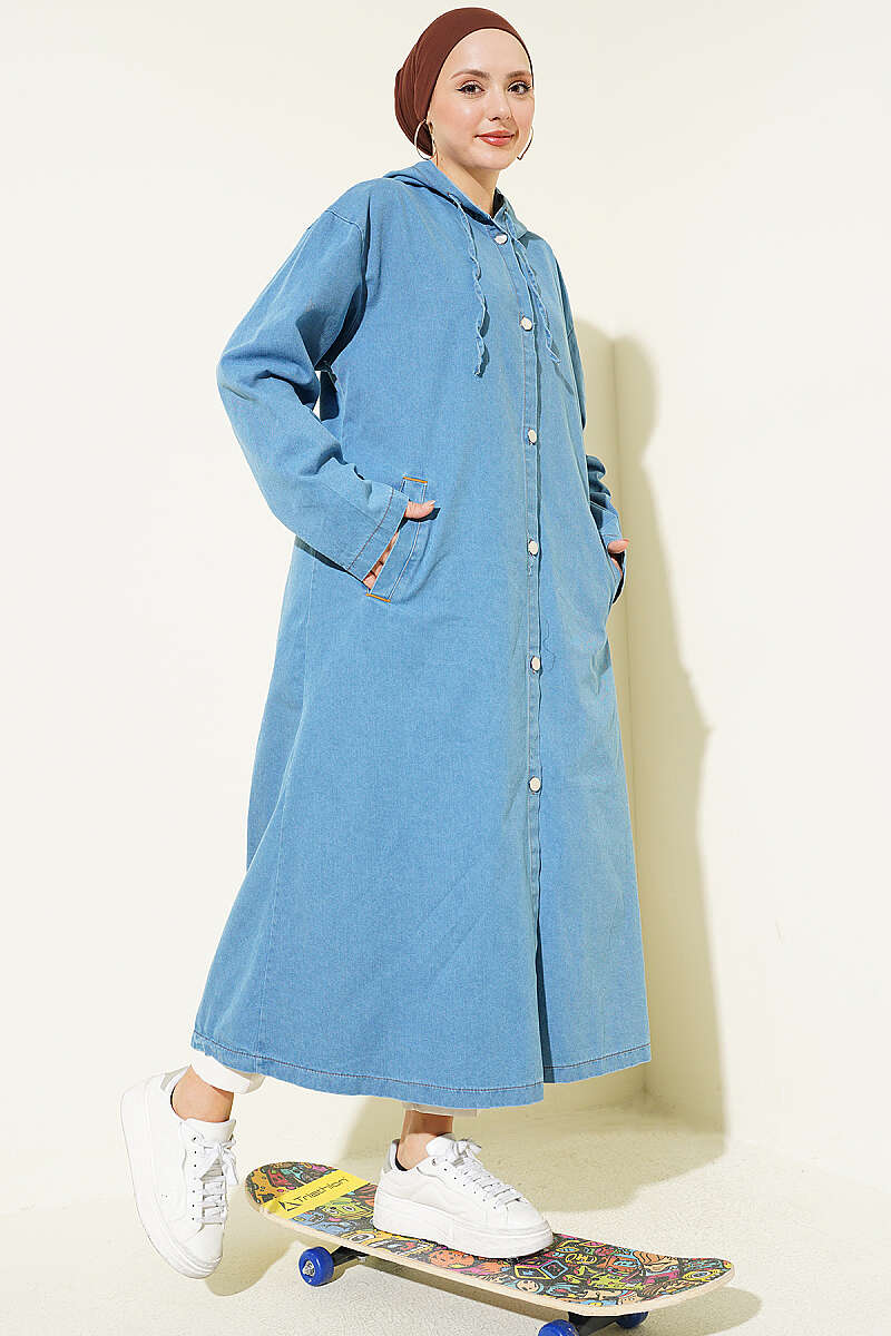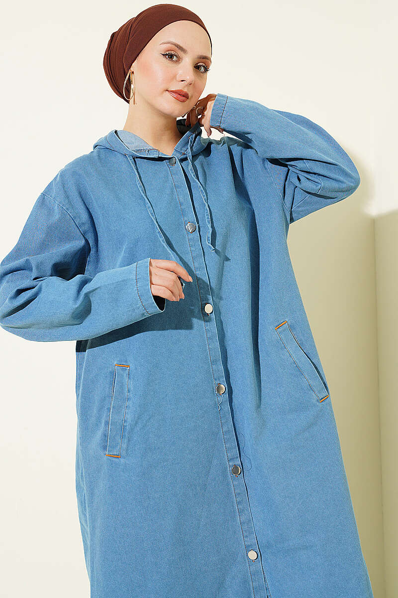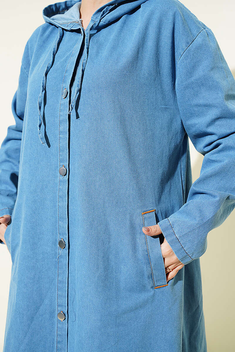 Kapüşonlu Metal Düğmeli Kot Kap Açık Mavi