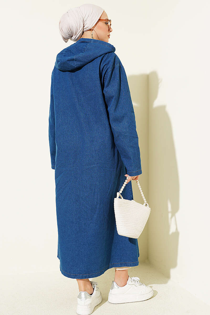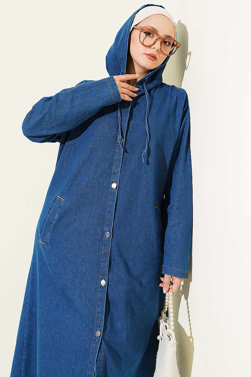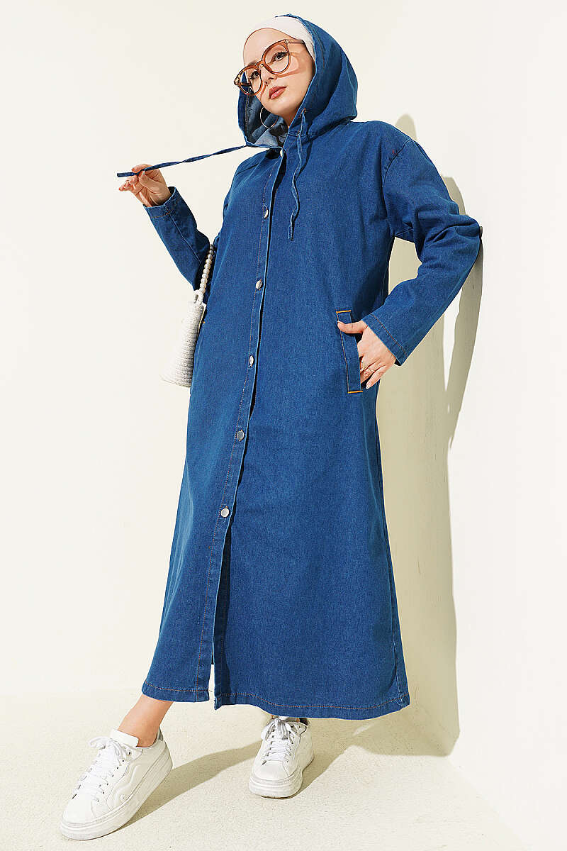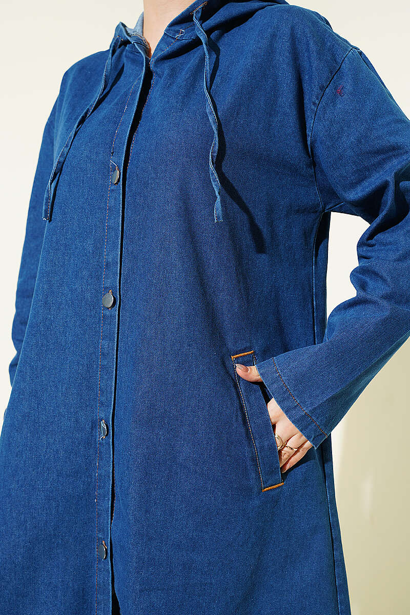 Kapüşonlu Metal Düğmeli Kot Kap Mavi