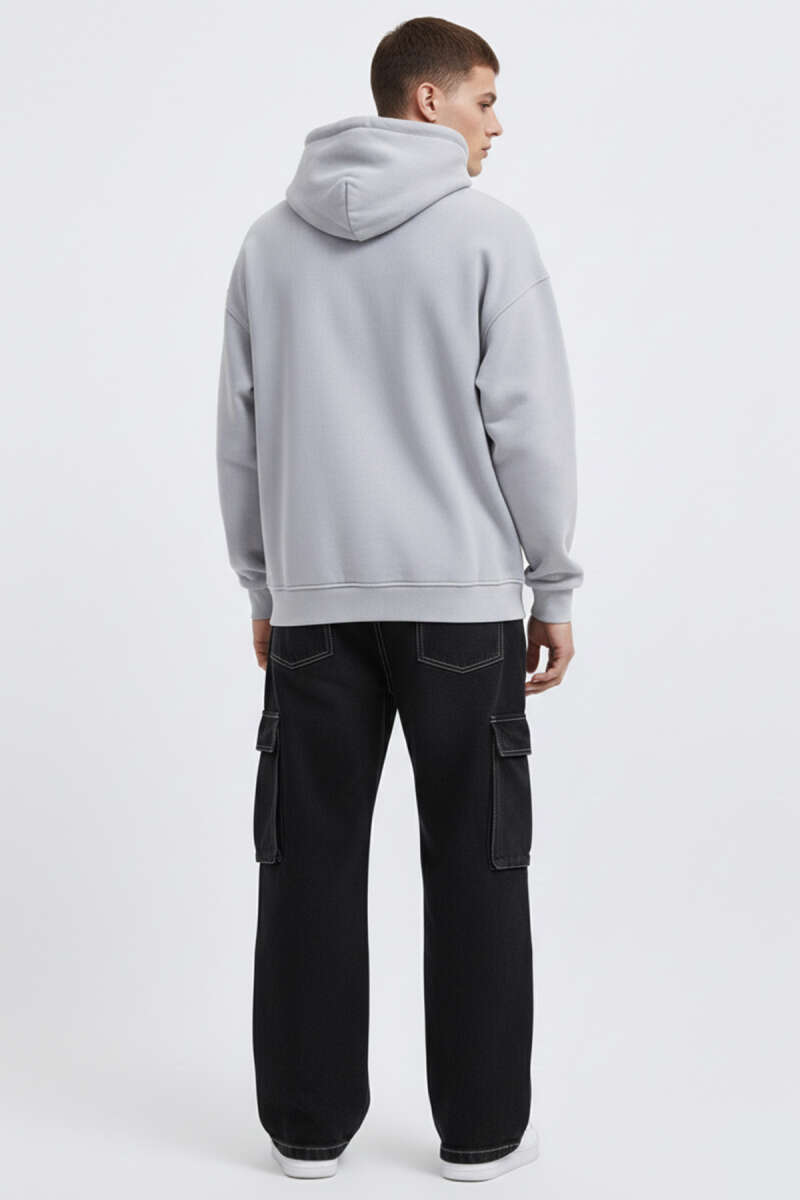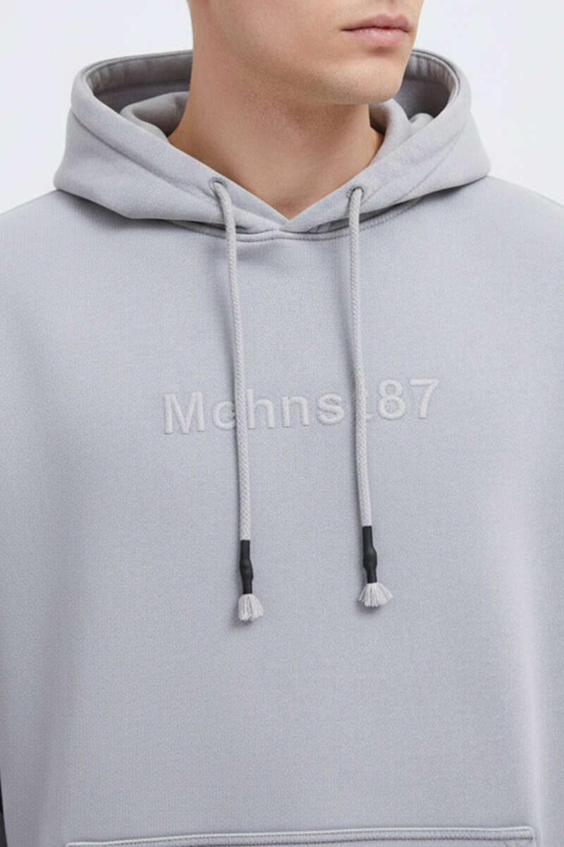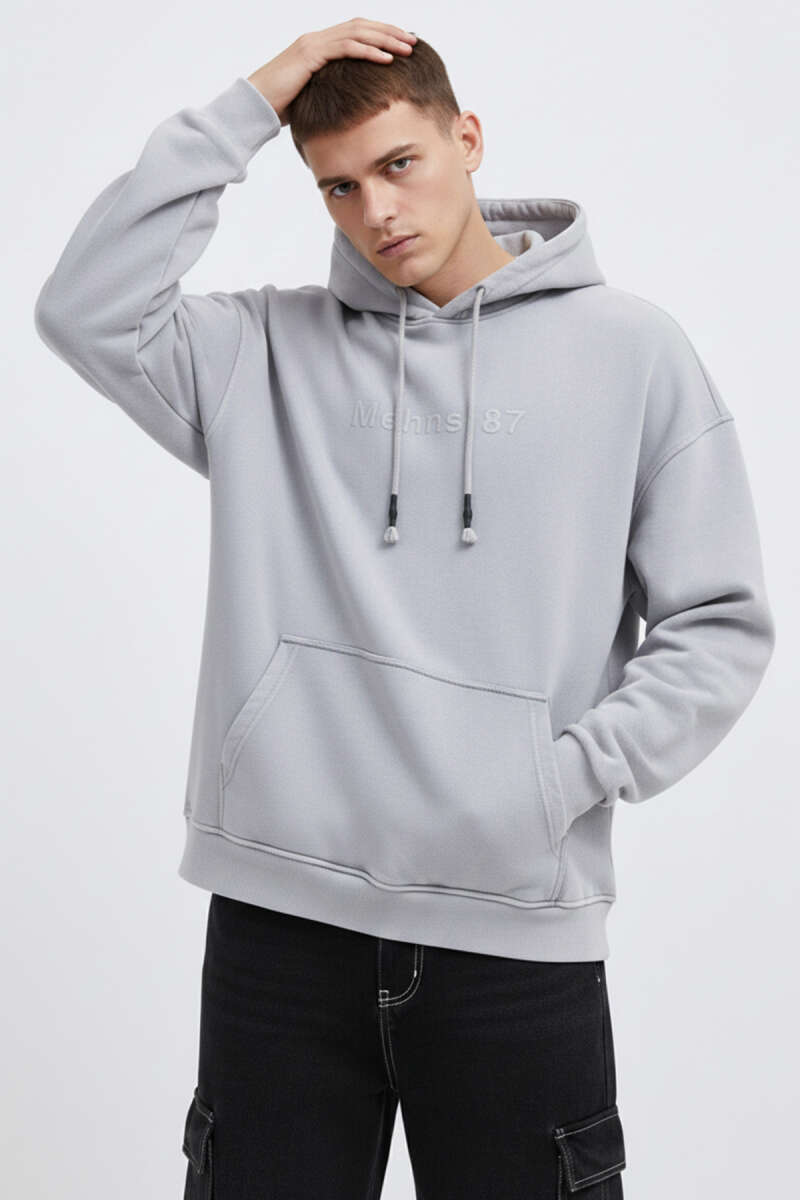 Kapüşonlu Nakışlı Oversize Erkek Sweatshirt Gri