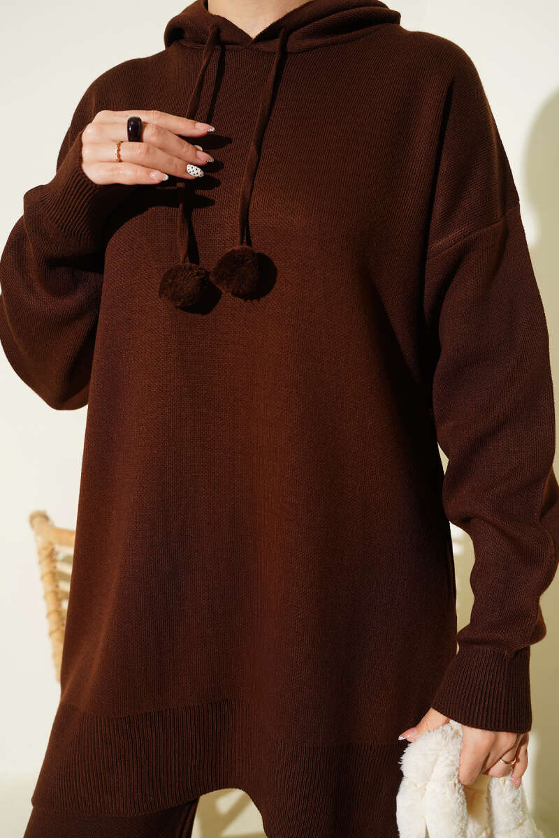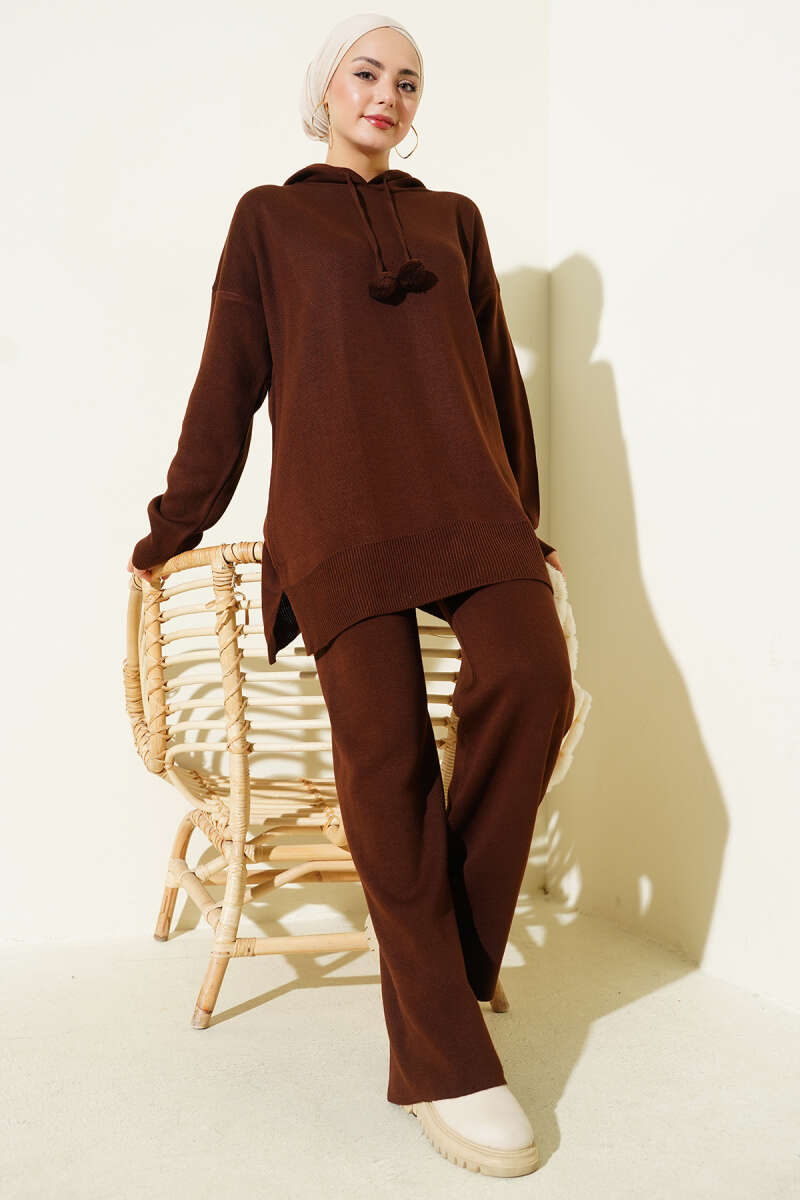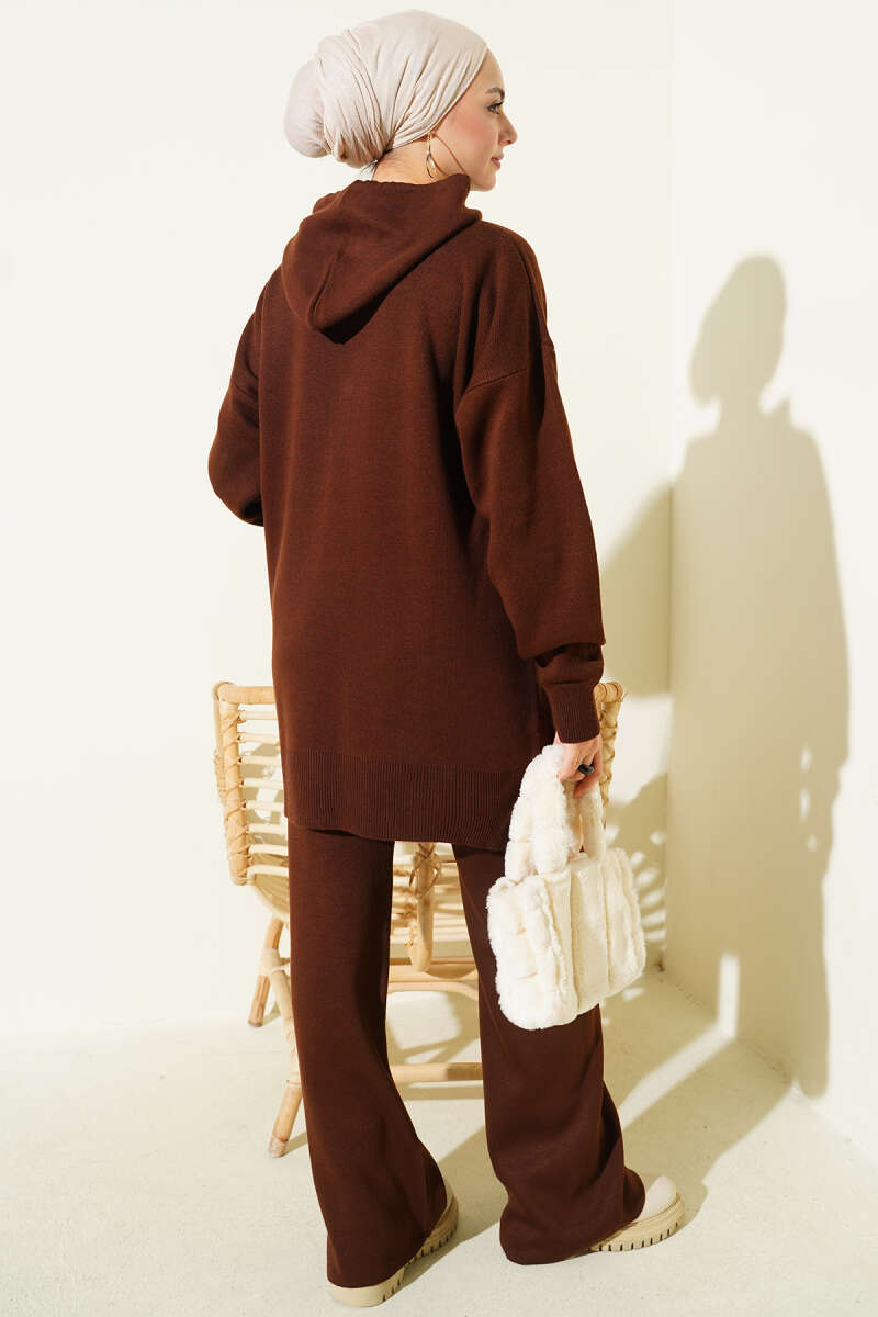 Şerit Detaylı Düğmeli Triko İkili Takım Kahve