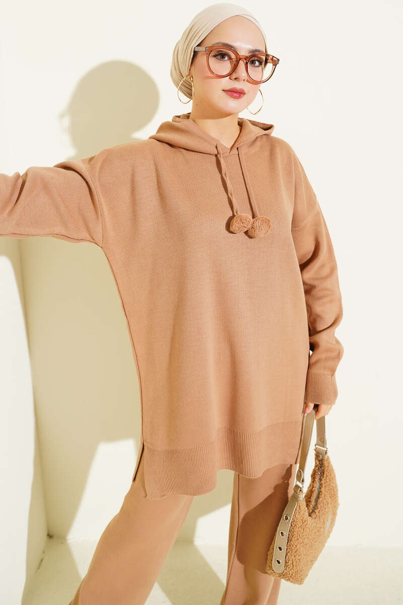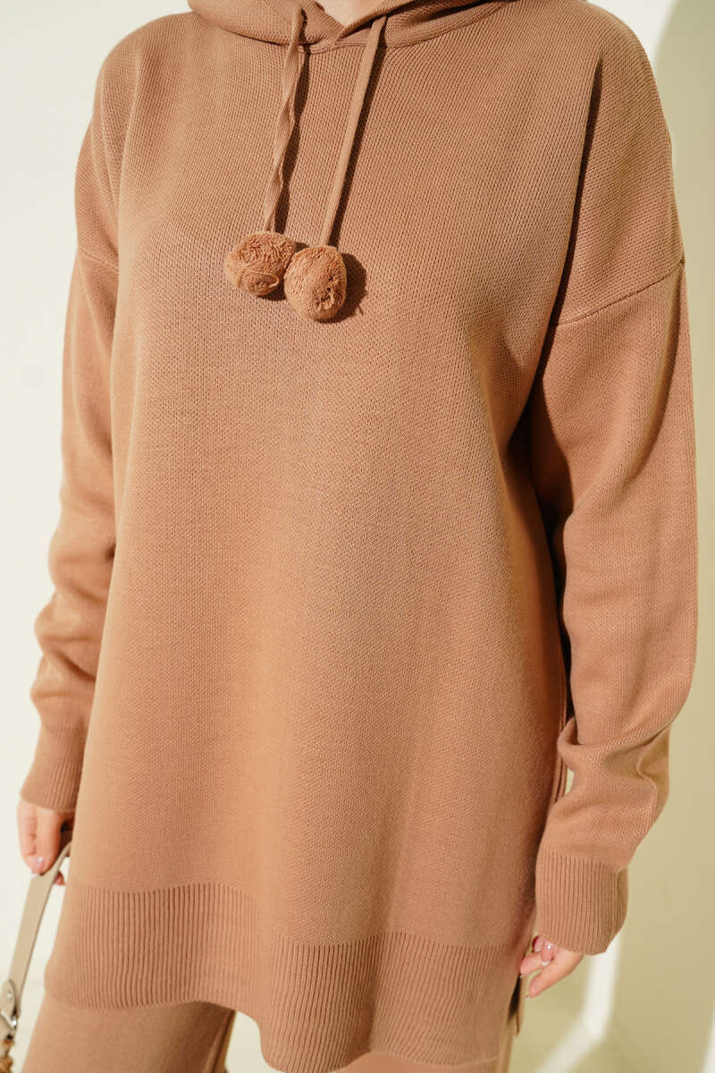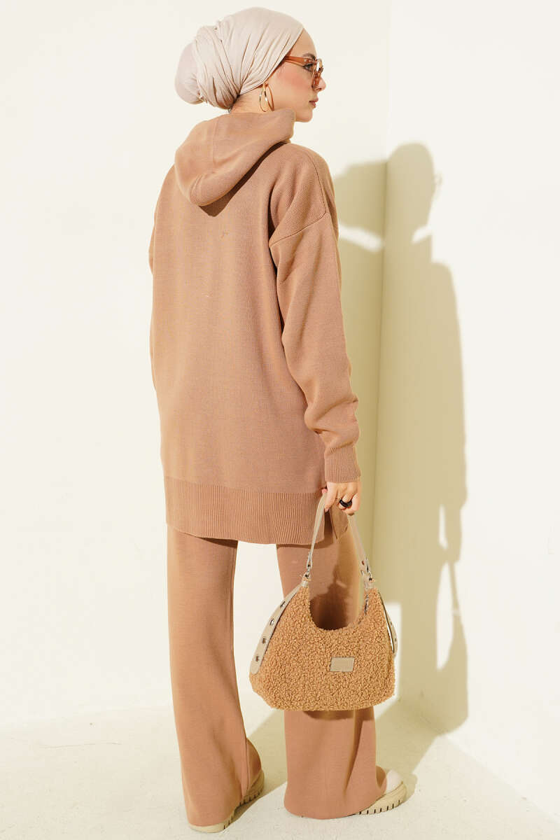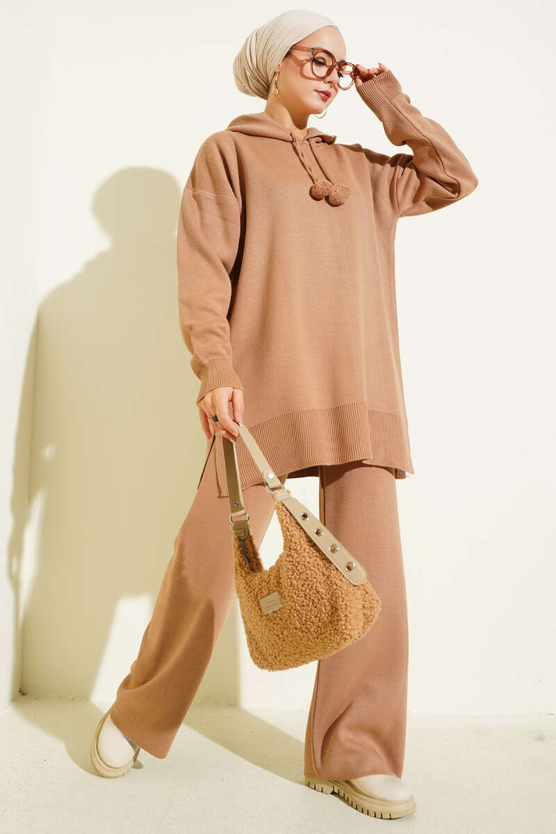 Şerit Detaylı Düğmeli Triko İkili Takım Latte
