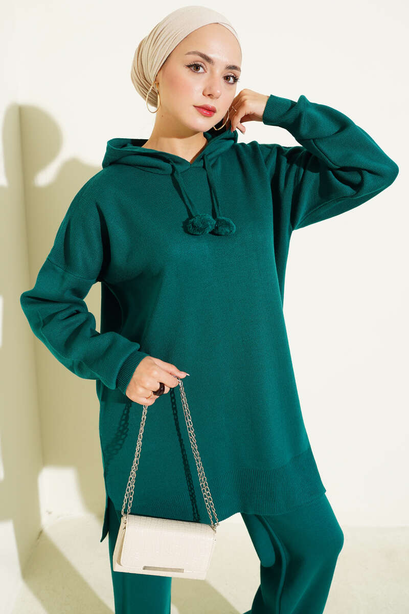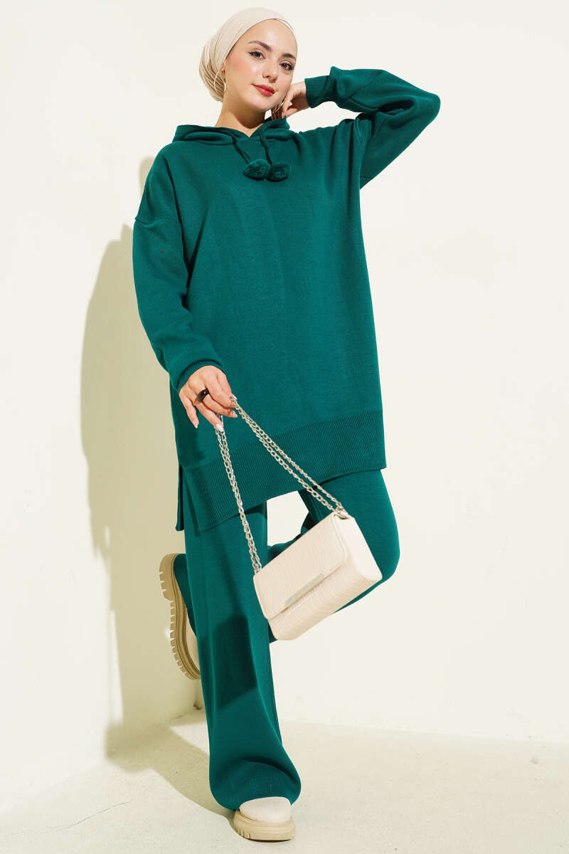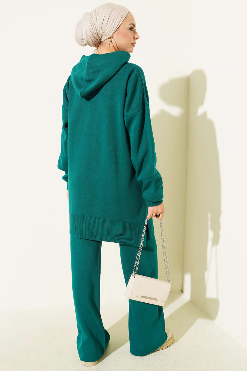 Şerit Detaylı Düğmeli Triko İkili Takım Zümrüt