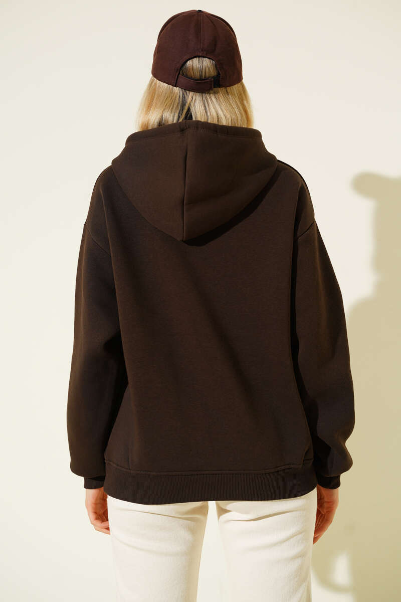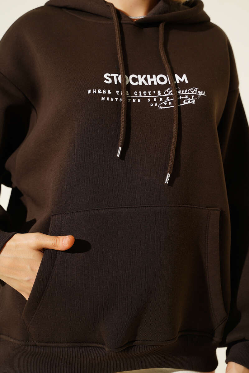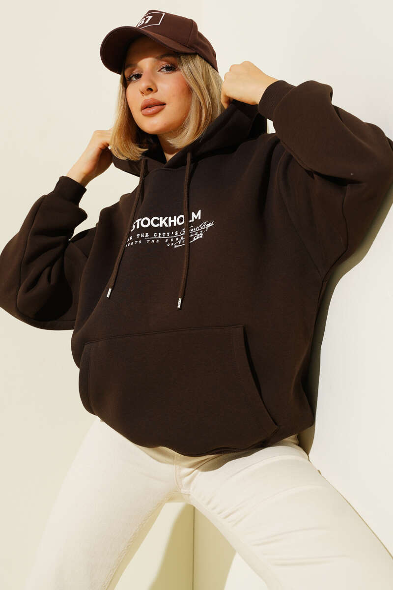 Kapüşonlu Stockholm Baskılı Sweatshirt Kahve