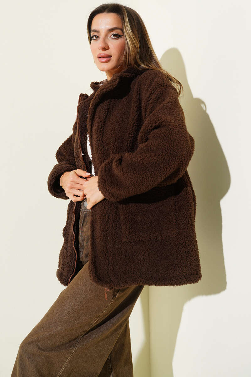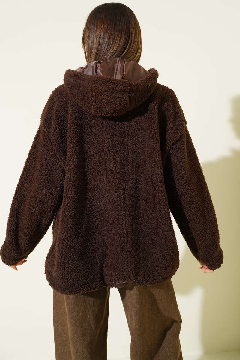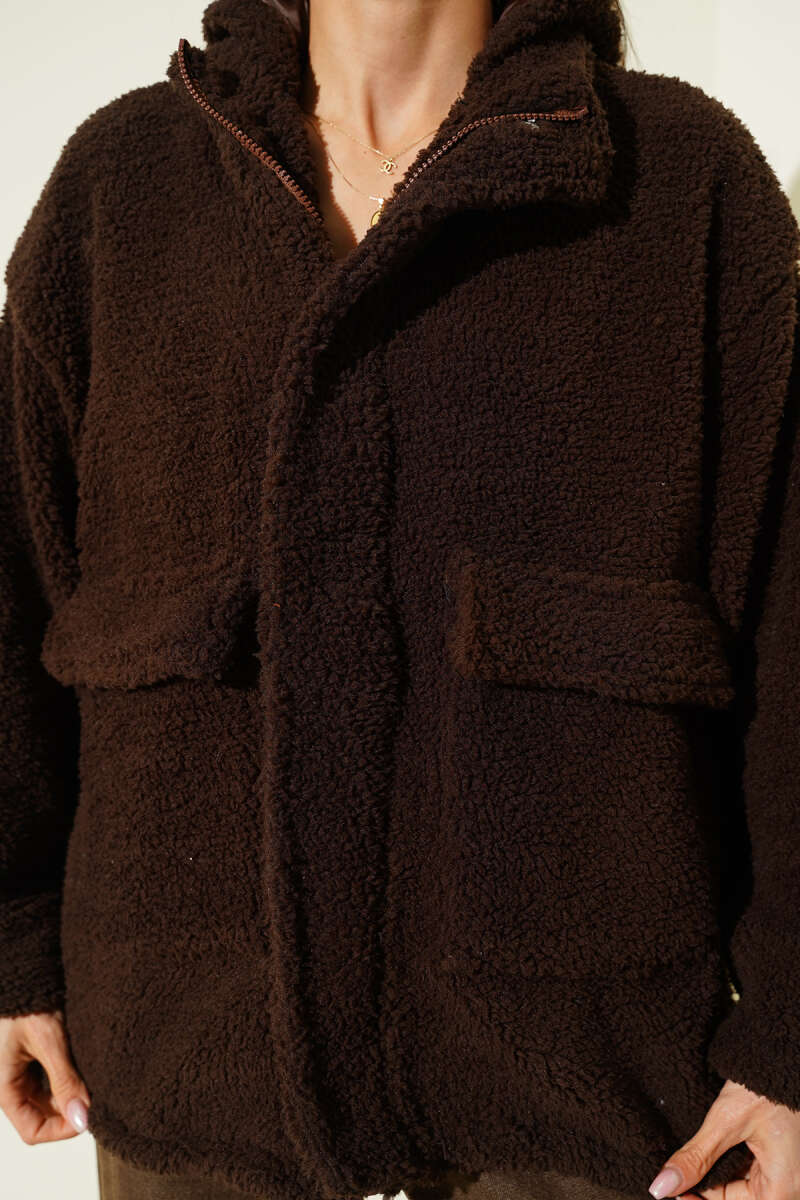 Kapüşonlu Torba Cepli Peluş Mont Ekru