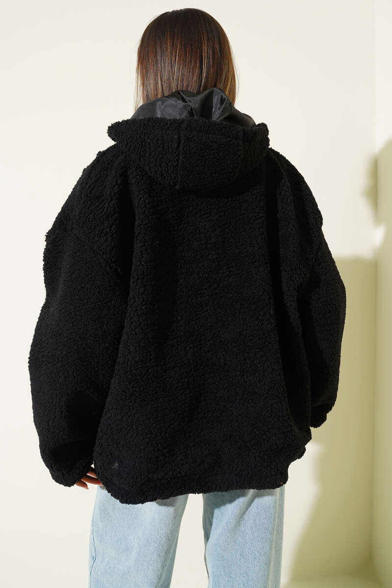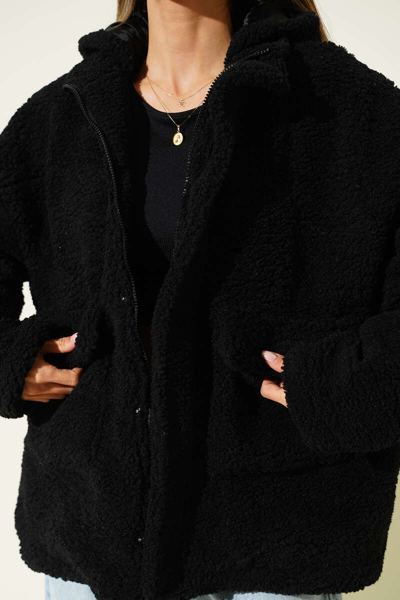 Kapüşonlu Torba Cepli Peluş Mont Kahve