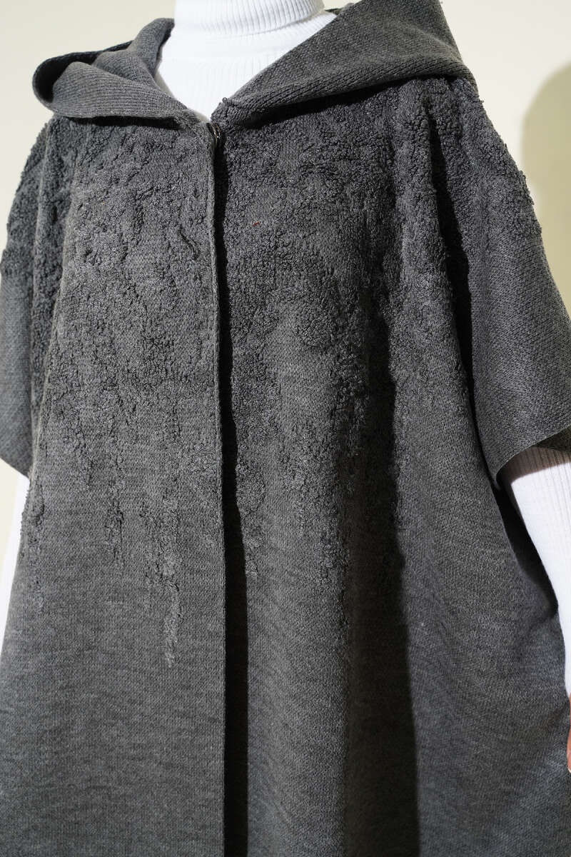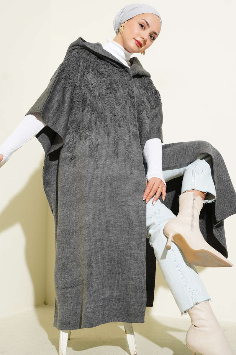 Kilim Desen Kapüşonlu Panço Siyah Kahve