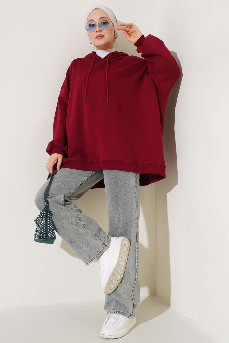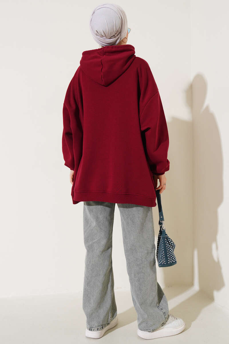 Kapüşonlu Üç İplik Oversize Sweatshirt Bordo