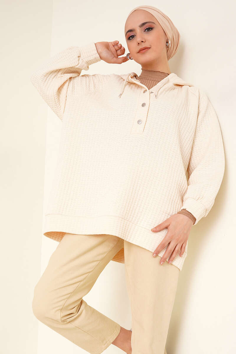 Yeni sezon waffle kumaş tuniğimiz kapüşonludur. Kapüşonu ip bağlamalıdır. Yakası çıtçıt düğmeli olan tuniğimizin beş düğmesi vardır. Salaş görünüme sahip tuniğimiz sportif şıklığı size sunmaktadır.