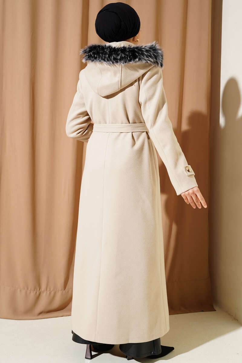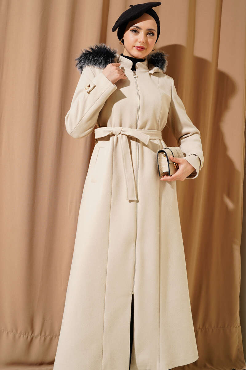 Kapüşonu Kürklü Fermuarlı Uzun Kaşe Kaban Taş