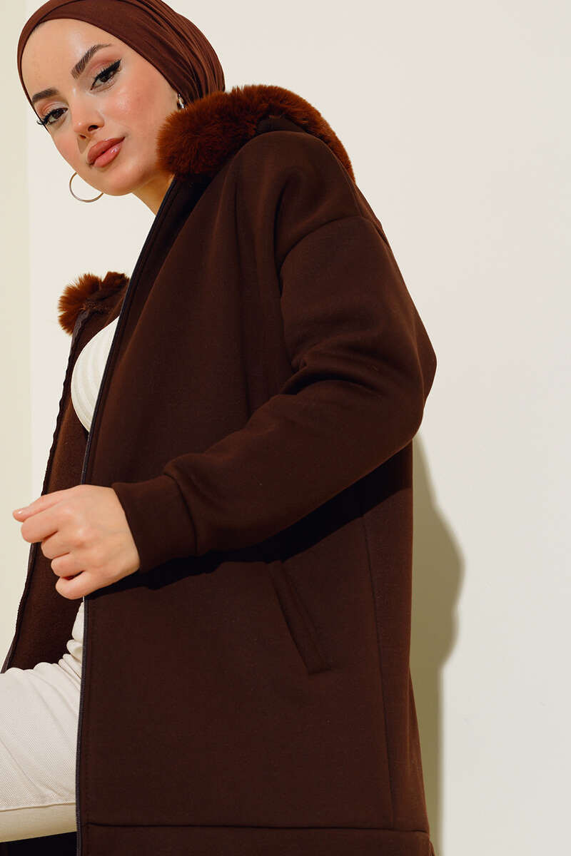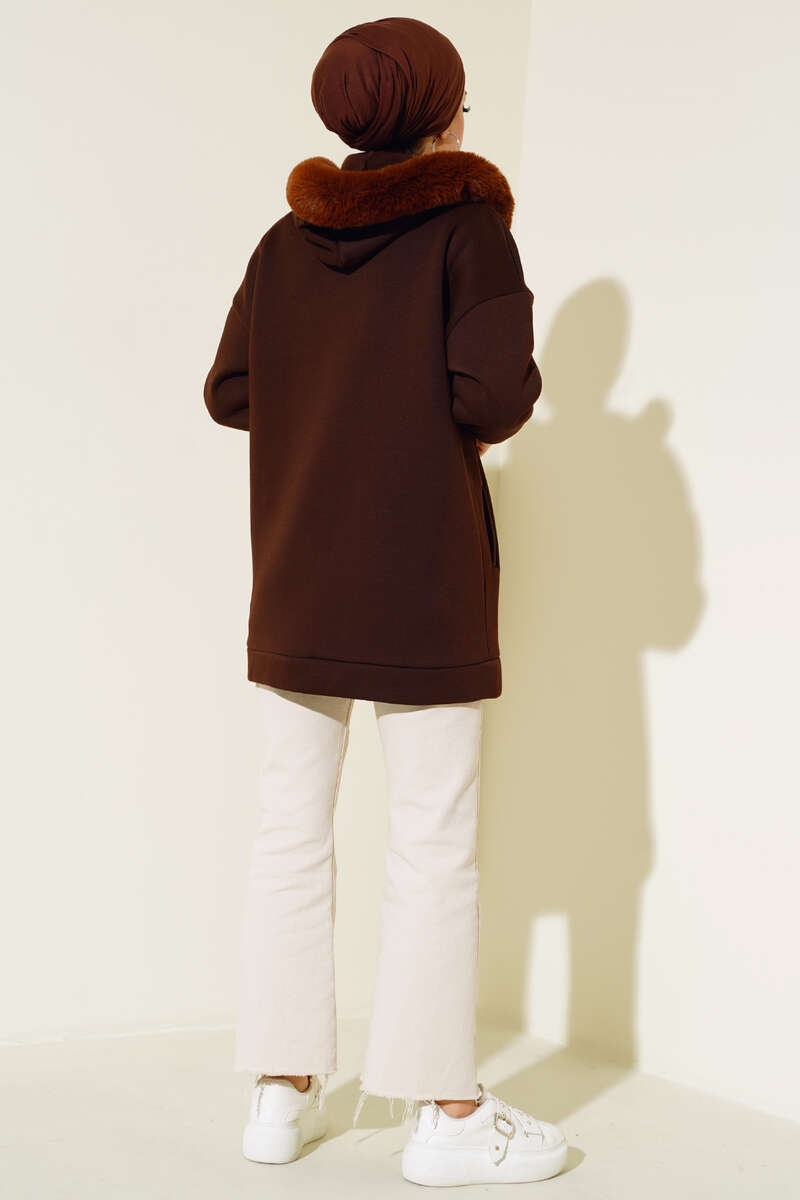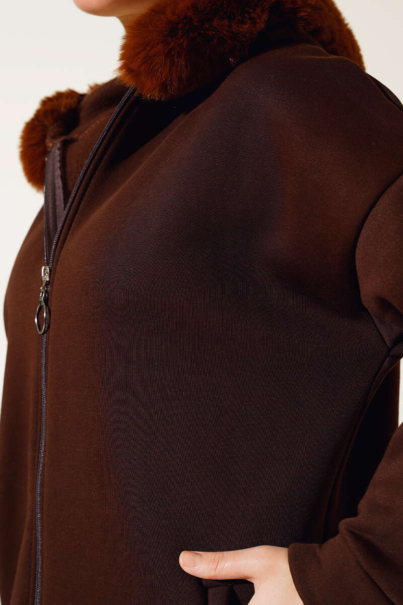 Hırkamızın içi şardonlu modeldir. Ürünümüz kapüşonlu olup kapüşonu kürklüdür. Boydan fermuarlı olan tunik düşük omuzludur. İki adet cebi bulunmaktadır.