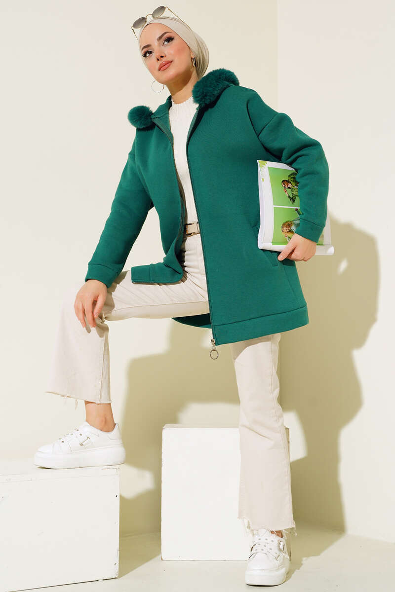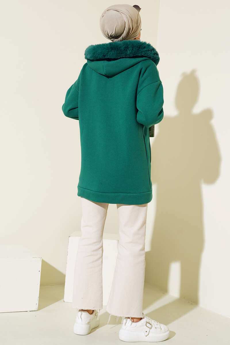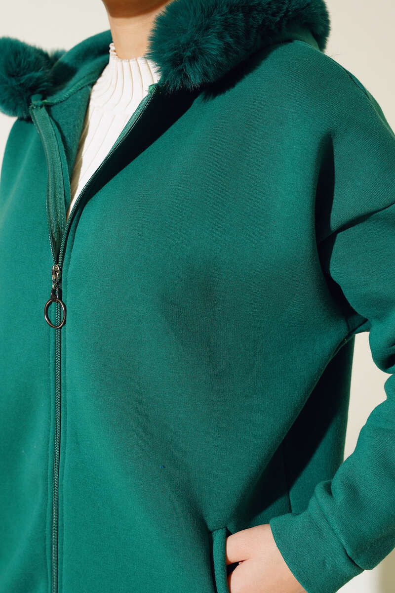 Kapüşonu Kürklü Hırka Zümrüt Yeşili